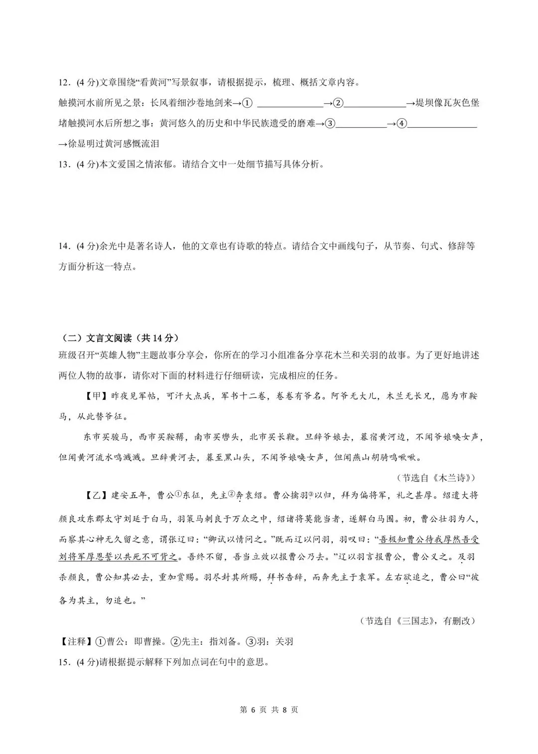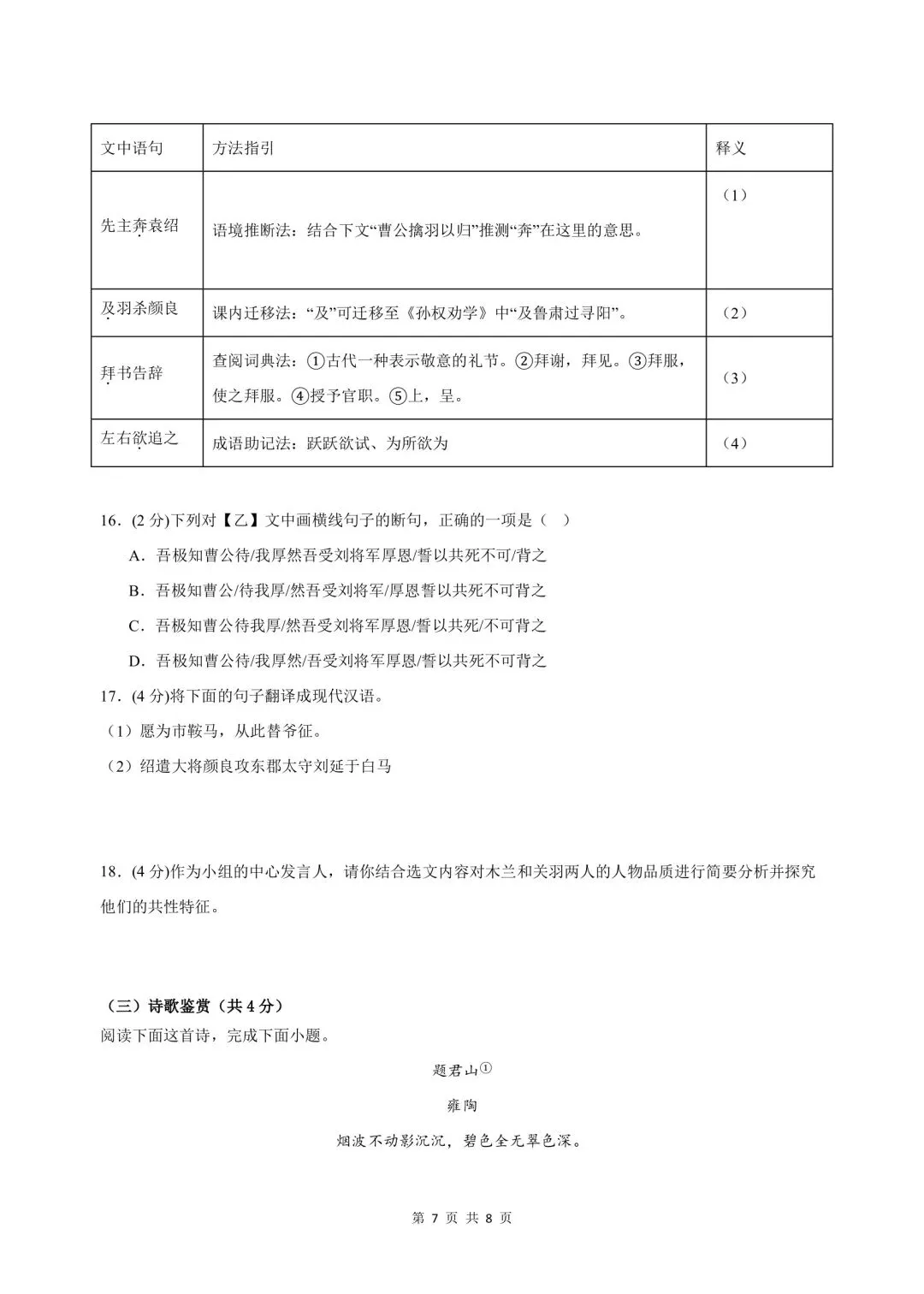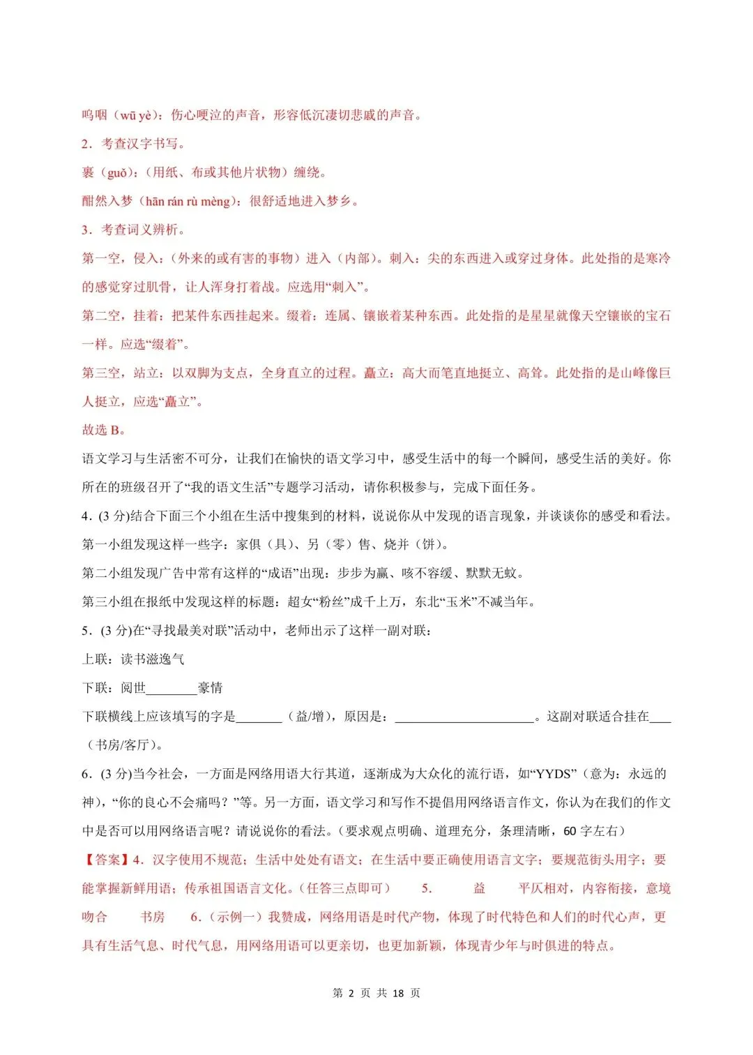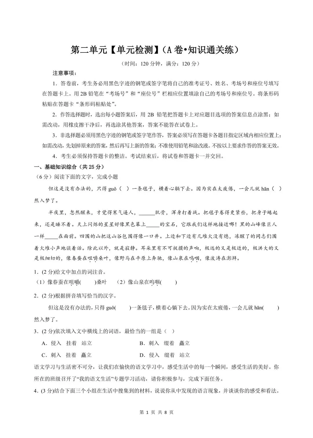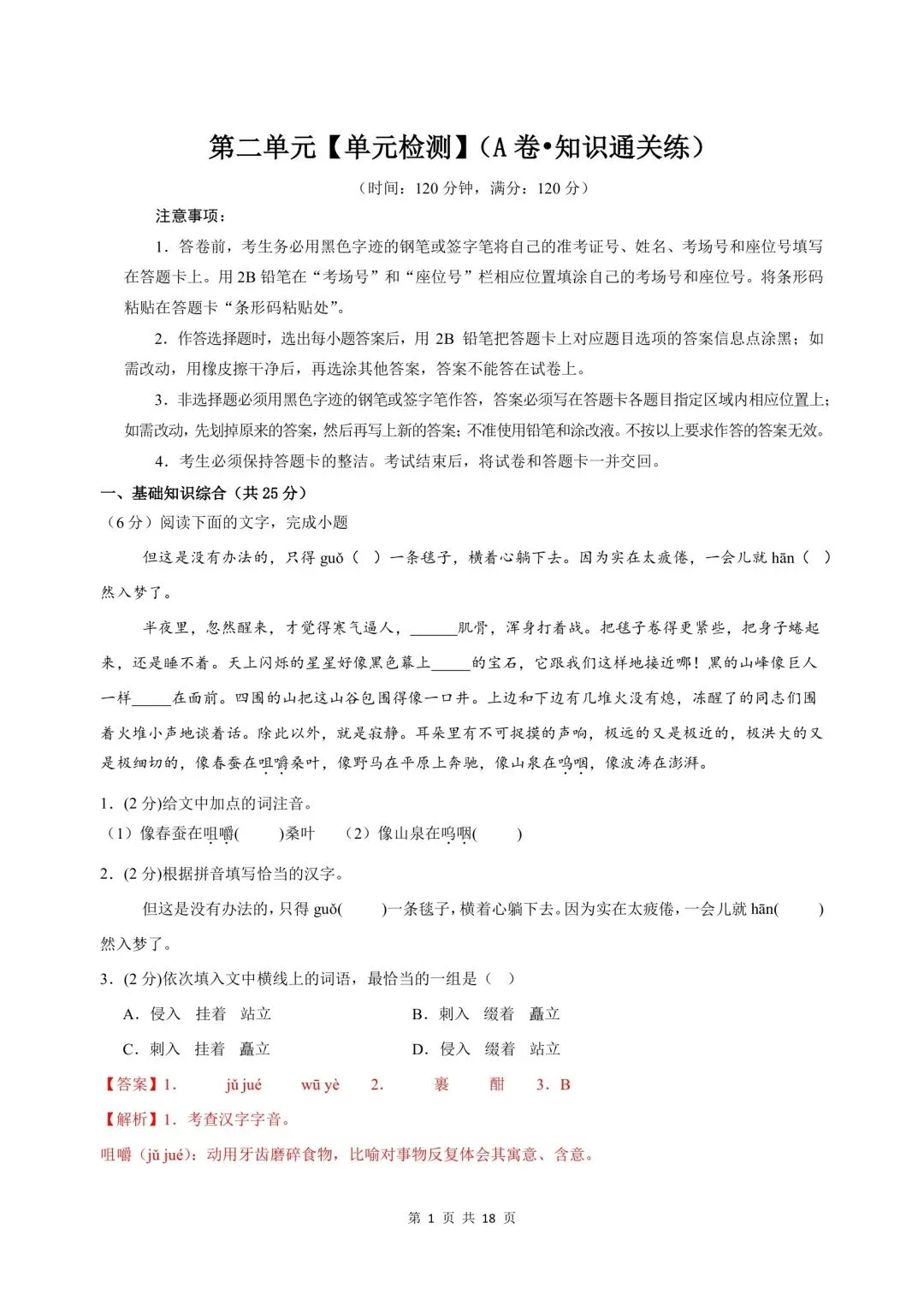 2026年春新版七年级下册人教部编版语文第二单元检测卷【基础知识通关练】含答案,电子版可打印