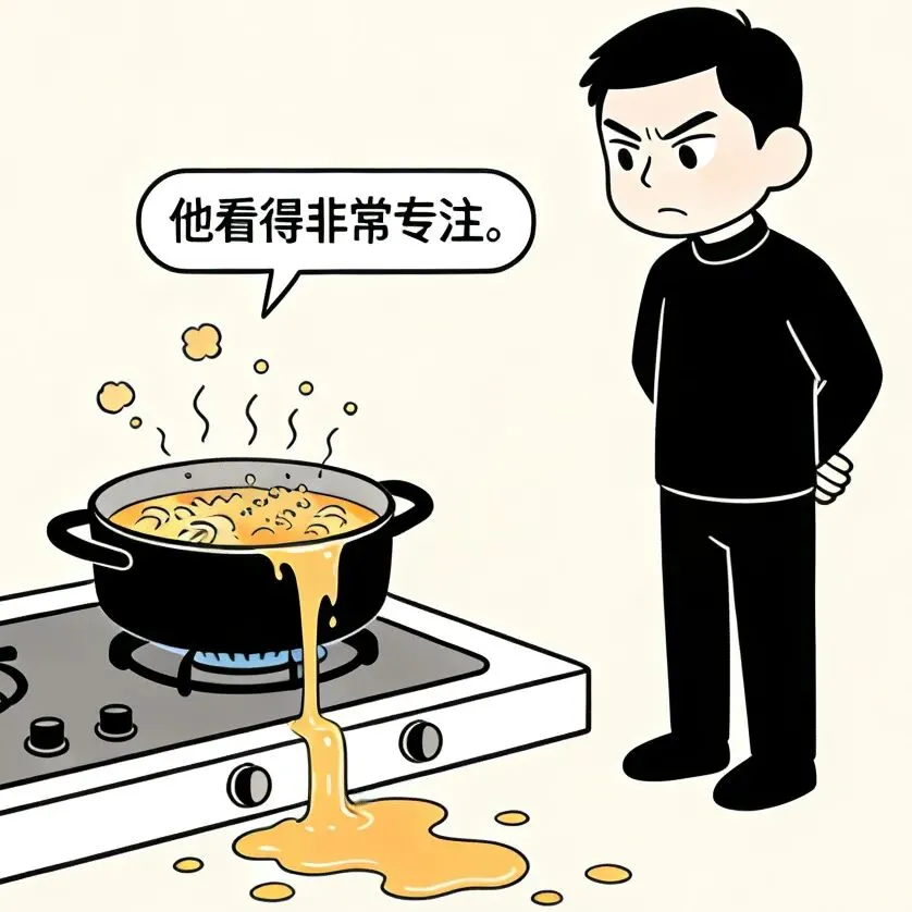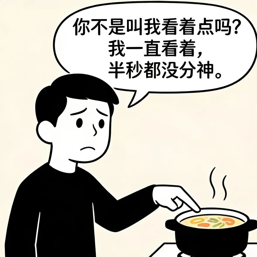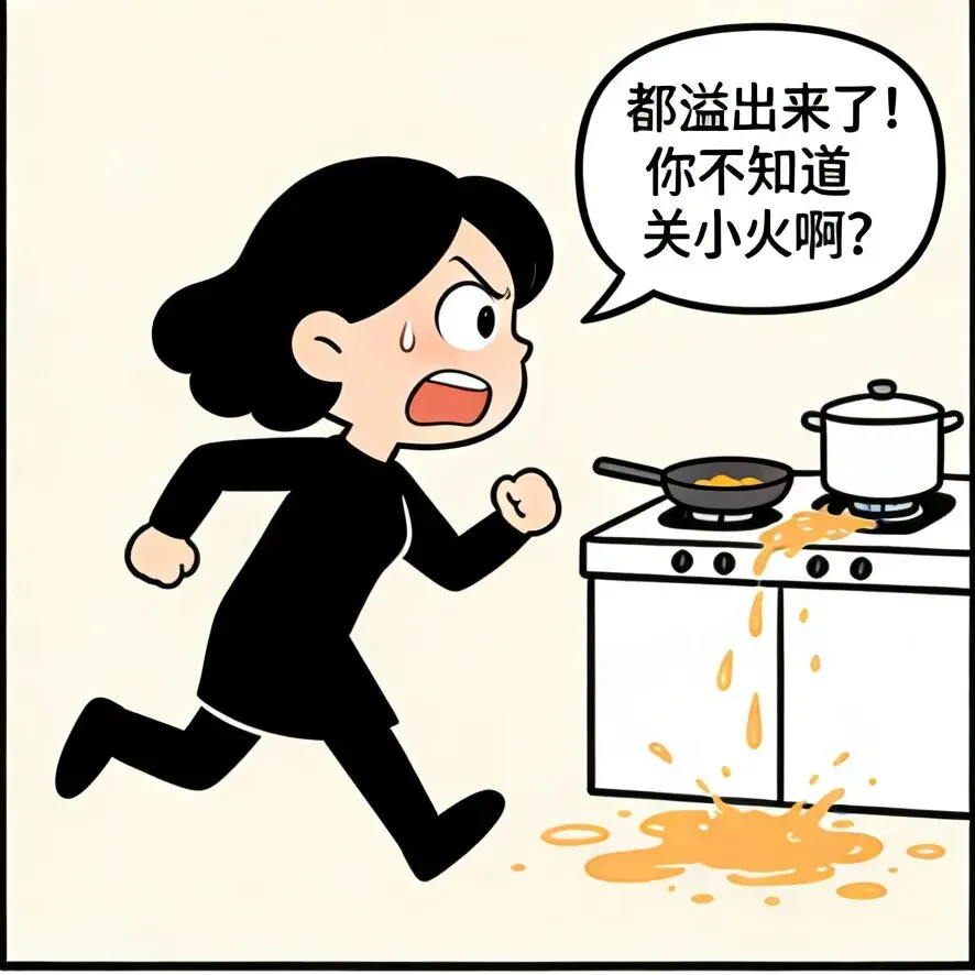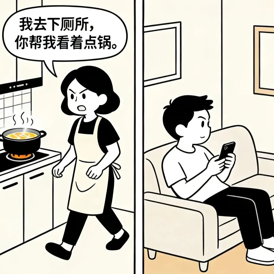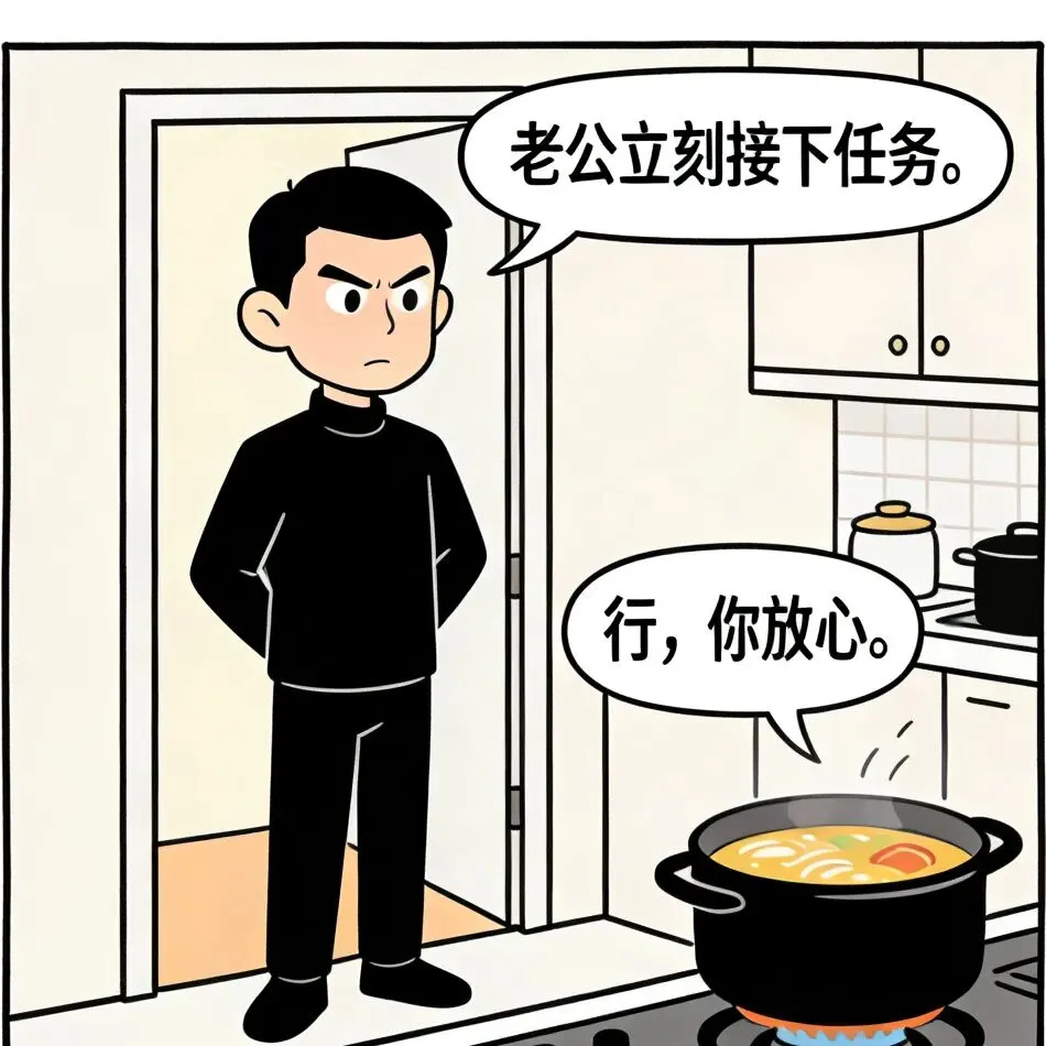 开心漫画时刻:老婆:我去下厕所,你帮我看着点锅.老公:行,你放心.老婆:都溢出来了!你不知道关小火啊?老公:你不是叫我看着点吗?