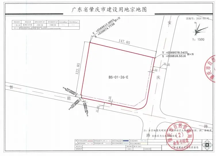 地块区位。项目地块位于鼎湖区永安镇贝水,东为安庆路,南为智能二路,地块编号为 BS-01-26-E号。