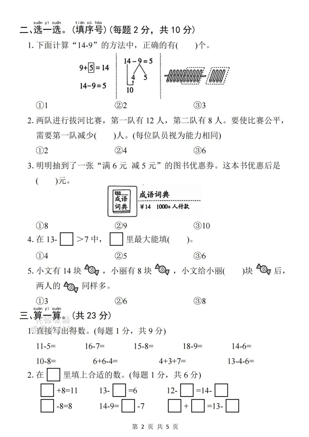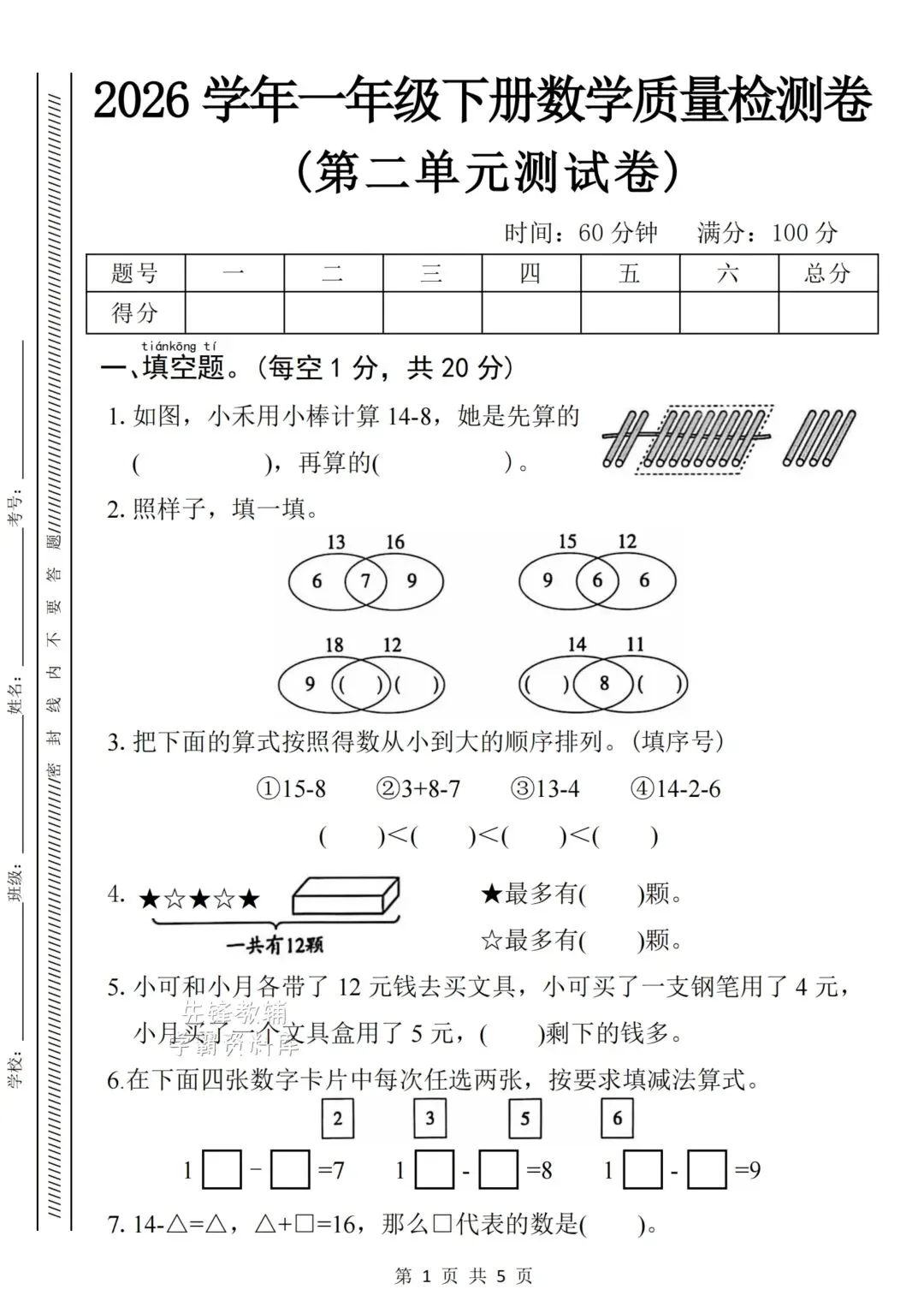 今日分享2026年最新版《一年级数学下册第二单元测试卷》电子版可打印。这份资料很全面,孩子每日只需花20分钟即可完成,学习更轻松,需要的家长赶紧给孩子打印一份学习吧。