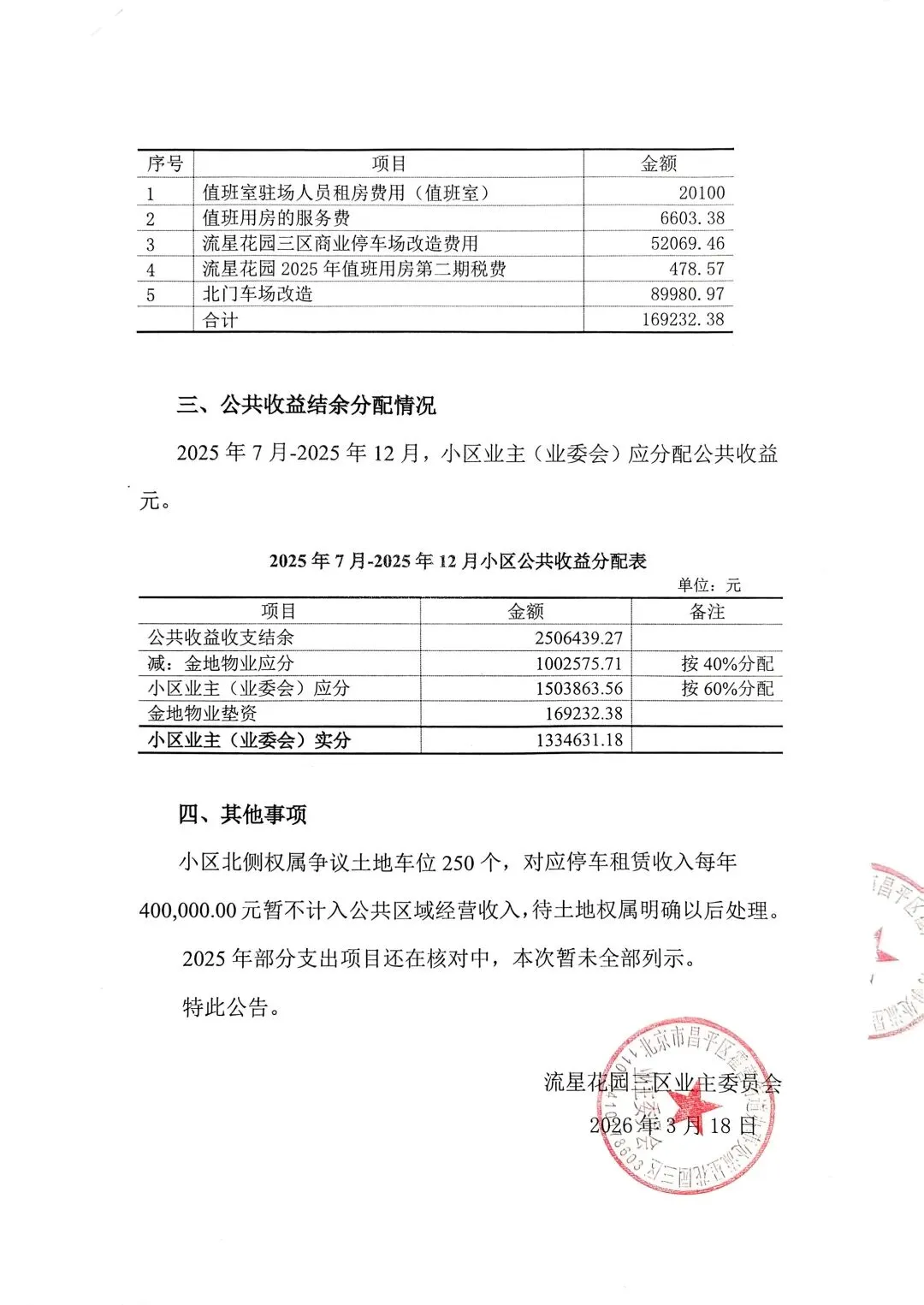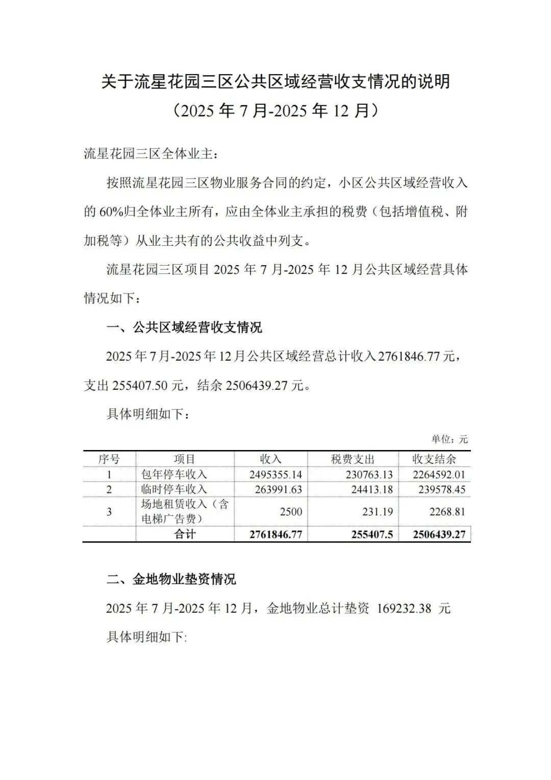 关于流星花园三区公共区域经营收支情况的说明(2025年7月-2025年12月)
