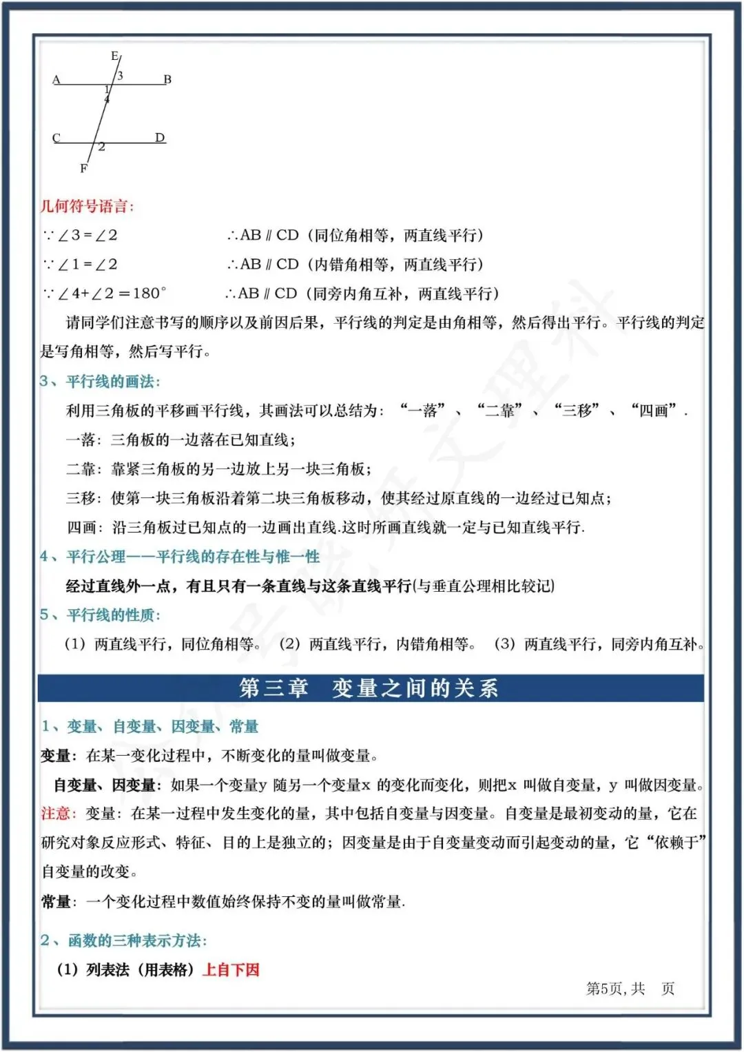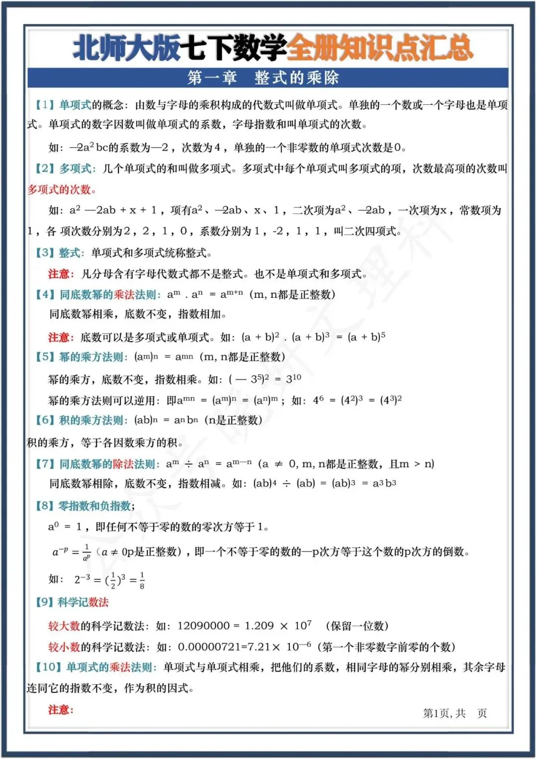 今天老师给大家整理了:吃透北师大版七下数学,六大单元知识点 + 解题技巧,考试不丢分!电子打印版!