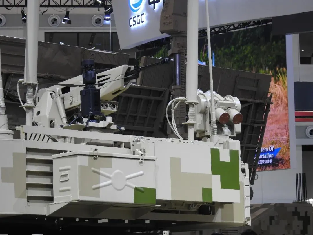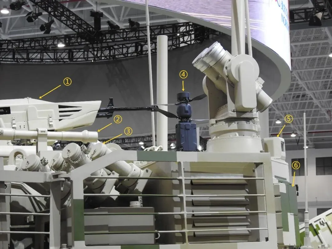 VT-5轻型坦克(5)(作者摄于2024年珠海航展)| VT-5炮塔后部的六联装抛射式烟幕弹榴霰弹发射器和激光预警接收机(烟雾弹发射器后蘑菇状设备)能够联动,当激光预警接收机发现来袭目标的激光照射时,坦克成员可接到预警信息,继而联动烟雾弹对激光或激光制导武器作出反应