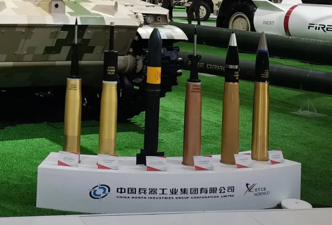 VT-5发射的弹种(作者摄于2024年珠海航展) | 从左到右依次编号:①BTA2型105毫米尾翼稳定脱壳穿甲弹,炮口初速1540米/秒,能在2000米距离穿透550毫米的等效垂直均质钢装甲;②DTP2型105毫米破甲弹,穿深应该能应对数百毫米厚度的等效垂直均质钢,但和所有穿甲弹一样,面对反应装甲时效能大打折扣;③GP105型炮射导弹,可以打击5公里之外的目标,还可以攻击直升机和低空低速的其它飞行器;④DTW2型105毫米尾翼稳定脱壳穿甲弹,炮口初速1530米/秒,能在2000米距离穿透460毫米的等效垂直均质钢装甲,足以应对对岸“勇虎”、M60A3坦克;;⑤DTB2型105毫米杀爆弹,炮弹重32公斤,主要依靠爆炸破片和爆炸冲击波杀伤目标,主要针对野战工事、设备、人员集群进行打击;⑥BTM1型105毫米攻坚弹,弹头由高强度钢材料制造,通过高初速赋予弹体巨大动能,实现在常见交战距离击穿1米以上厚度混凝土层的能力,钝感高能炸药延时在工事内部爆炸,产生冲击波和破片杀伤人员、破坏设备