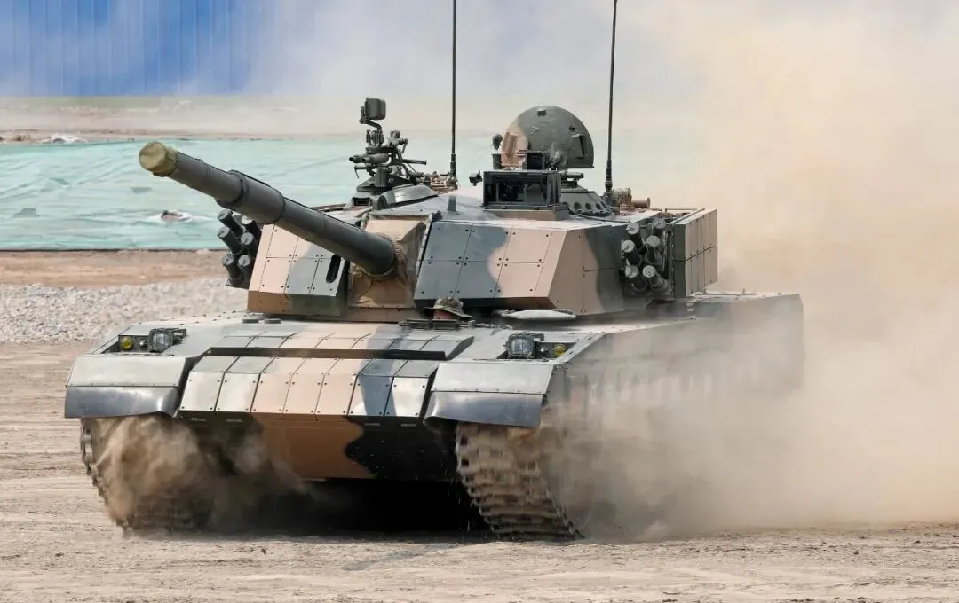 “终极”形态的VT-4(2)(图片来源:搜狐@倚梦倾城《谁要的VT4改进型?侧面重爆反甲,炮塔APS防御,甲弹对抗反超99A》https://news.sohu.com/a/923202880_121645263)| 图中VT-4坦克防护进一步加强:①可见炮塔侧面原格栅的前半部分改成了爆反装甲,从而强化对乘员的防护;②主炮根部加装了外防盾,因此外形格外“民主”。作者也很好奇哪个国家订购了“终极”形态的VT-4