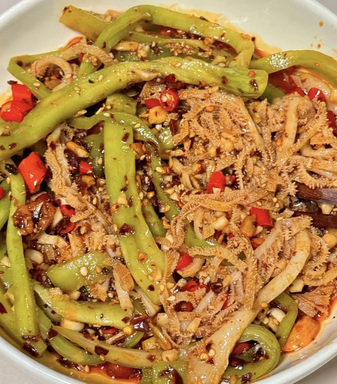 3️⃣调好的料汁倒入食材中,再加入两勺坚果油辣子抓拌均匀即可
