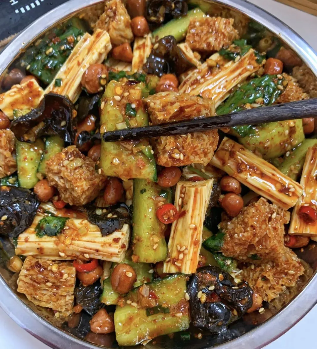 黄瓜、腐竹、黑木耳、面筋、熟花生米、香菜、葱花、蒜末, 小米椒