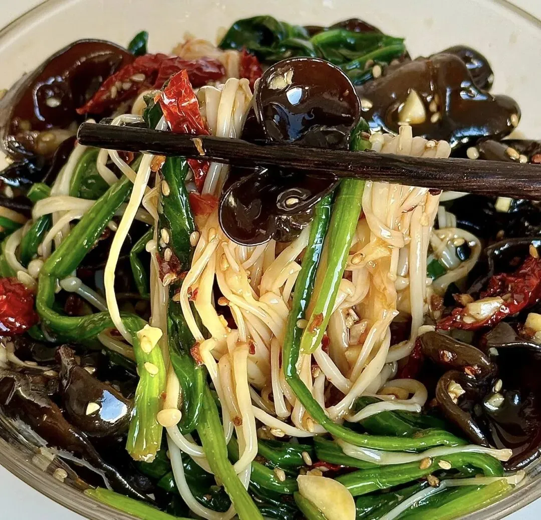3️⃣碗里放菠菜,木耳,金针菇,倒入调好的料汁,抓拌匀即可!