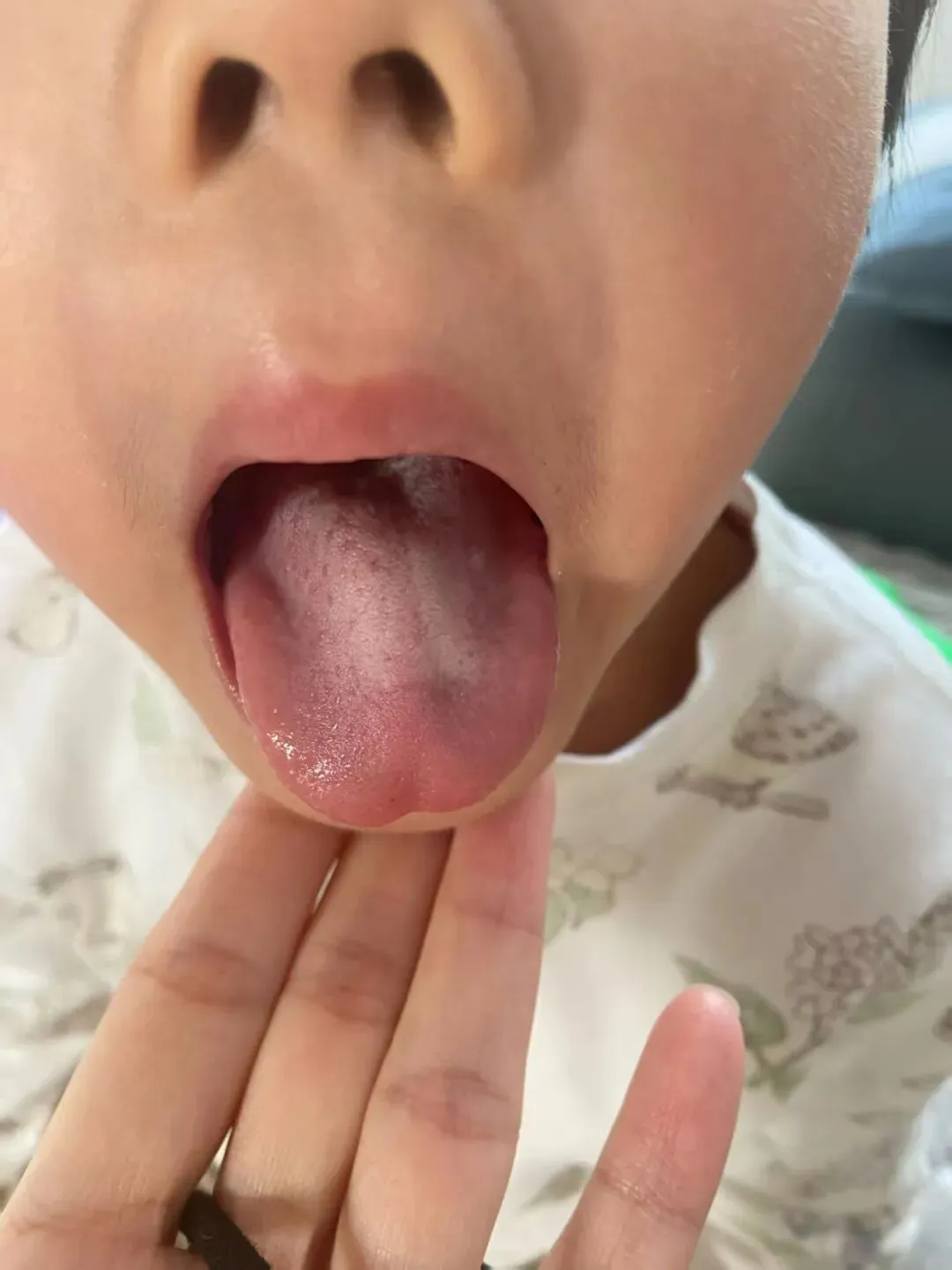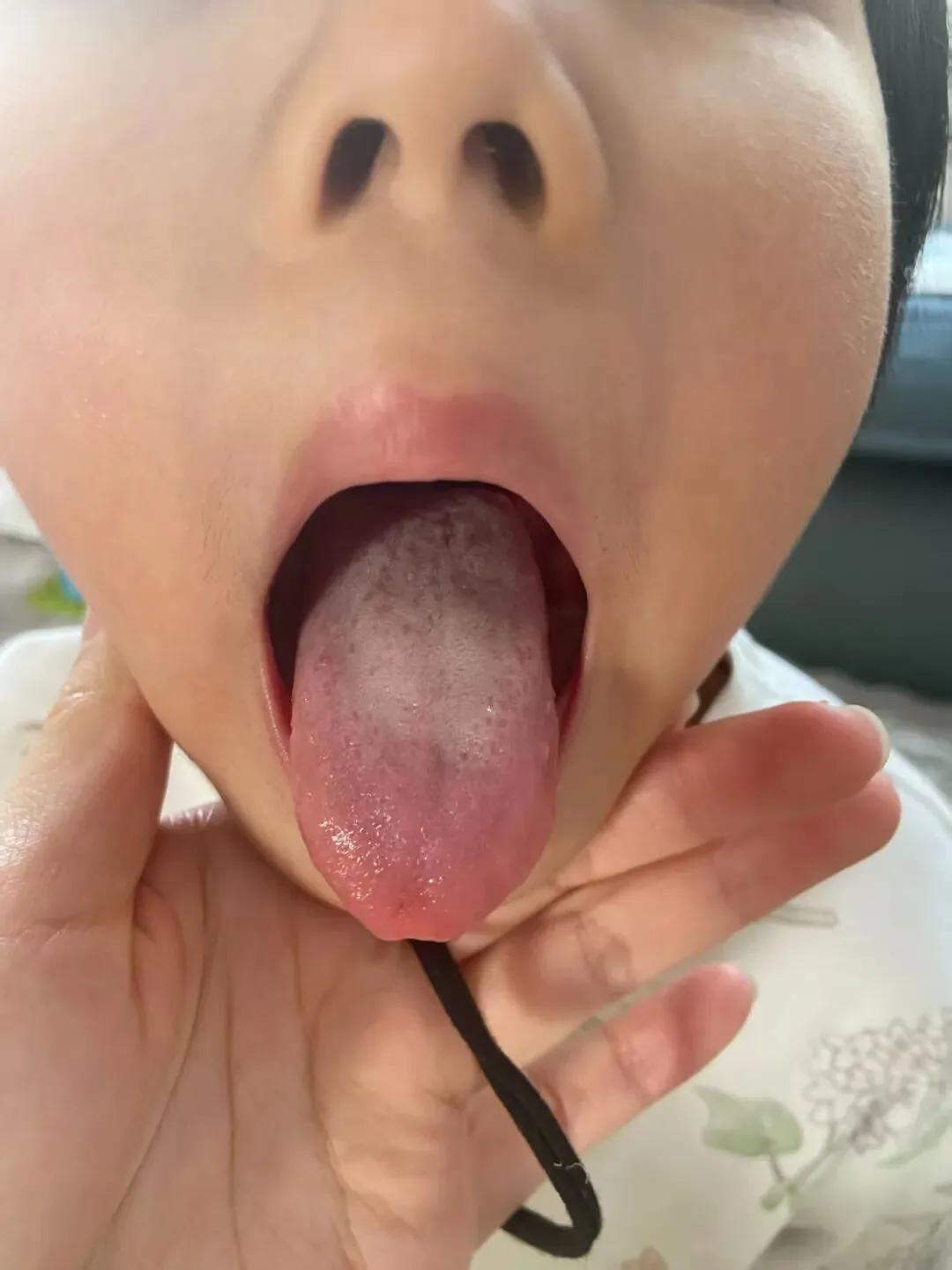 辨析:看患者舌苔肉质肉色新鲜,舌体也算圆润,舌中有凹陷,舌两边有凸起说明肝胆是有郁滞的。再看舌苔,舌苔少,只有舌两边有,有点白腻,根据患者之前舌苔少,且偏薄,最近一直花剥苔,是津液增多的同时收藏热力也变多了,热力变多就会消耗更多的津液,所以津液与热力极限拉扯,就出现这种花剥苔的状态,所以还要继续喝绿豆汤,增津凉降热力,等热力被收藏多了,津液也就生成的更多,形成良性循环。