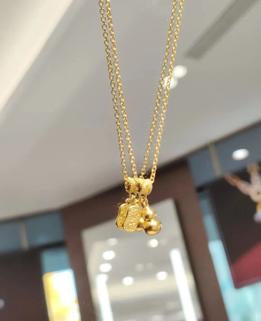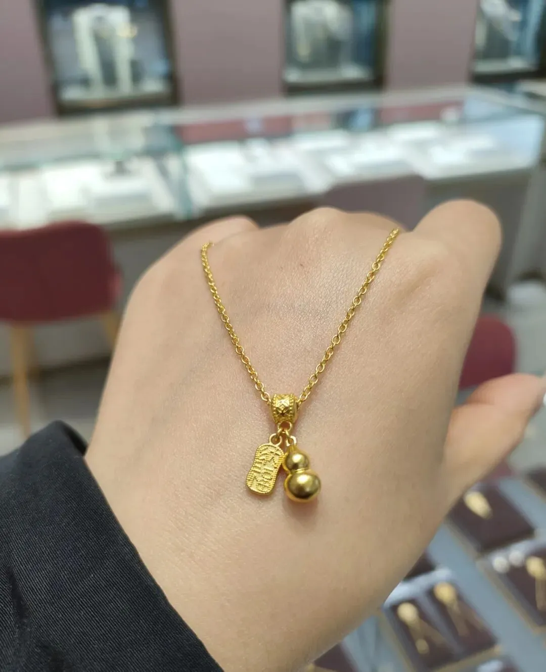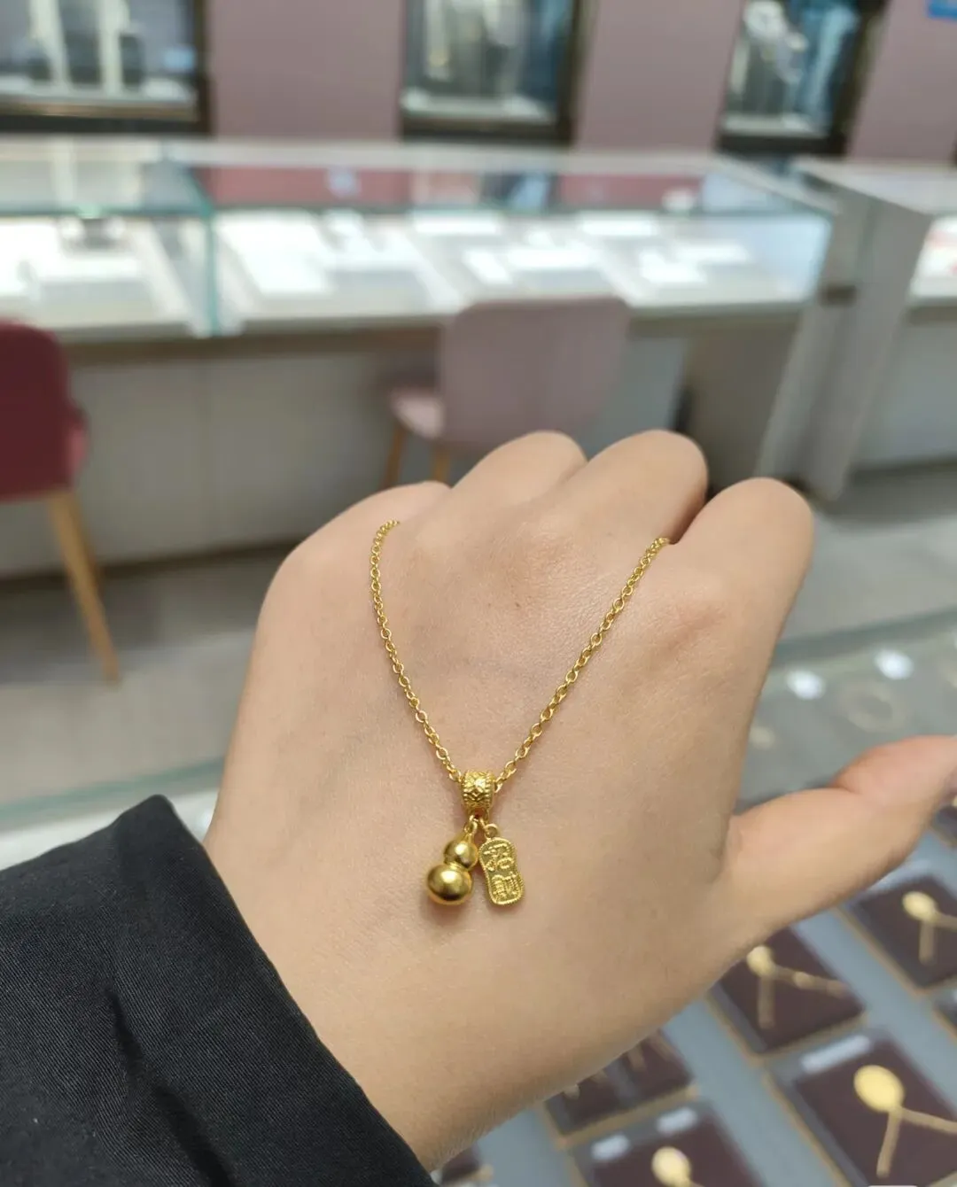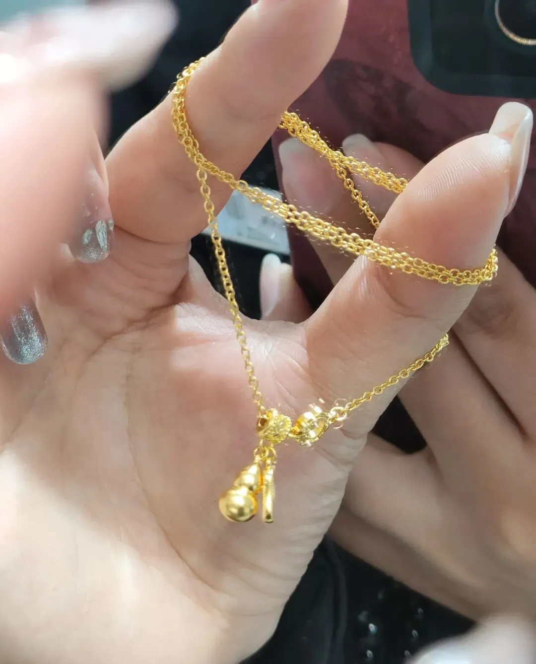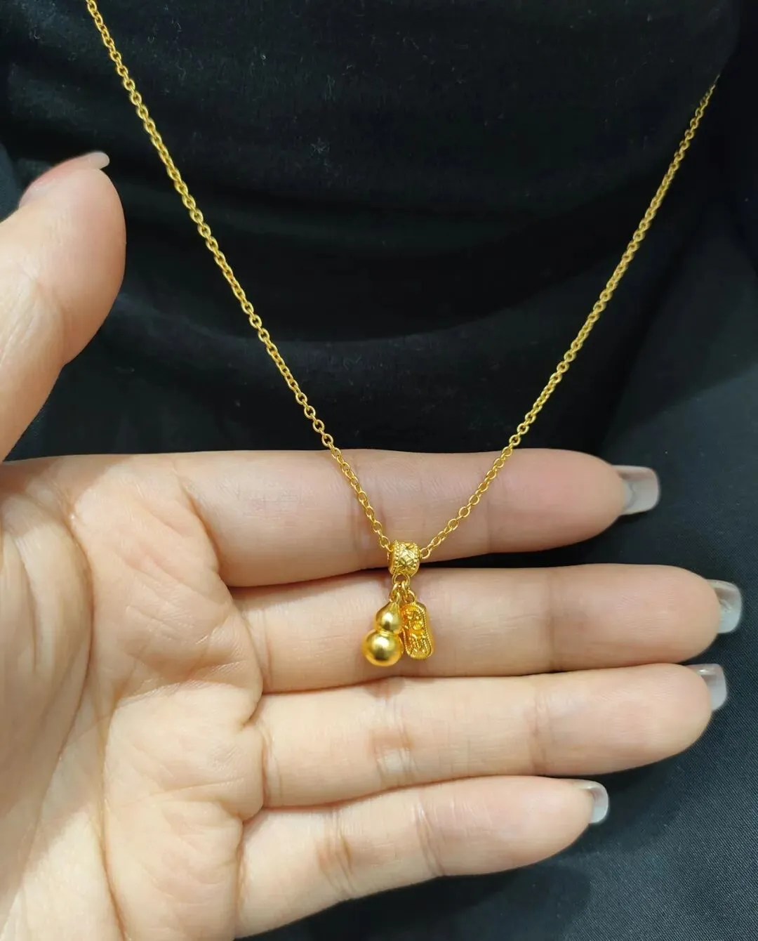 后来又陆续入了2克多的古法小葫芦,圆滚滚的造型特别讨喜,还带着福禄双全的好寓意。我平时要么单独配细链戴,要么和无事牌叠戴,层次感一下子就出来了,温柔又有质感。戴了快一年,依旧带着古法金独有的哑光柔光,完全不显旧。