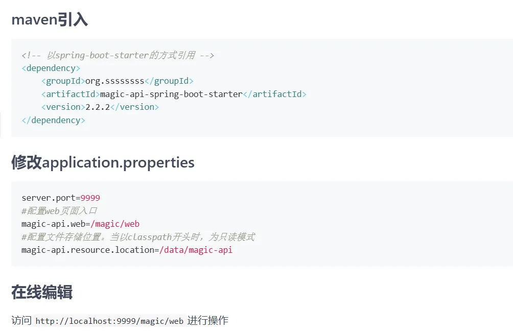 <dependency><groupId>org.ssssssss</groupId><artifactId>magic-api-spring-boot-starter</artifactId><version>2.2.2</version></dependency>