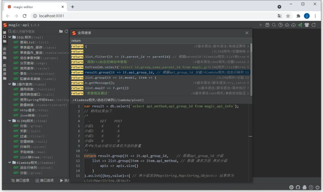 magic-api 并非一个传统意义上的框架。它没有要求你去继承某个基类,也没有强迫你实现特定的接口。它的核心思想非常激进:通过一个友好的Web UI界面来编写接口逻辑,框架会自动将其映射为标准的HTTP API。