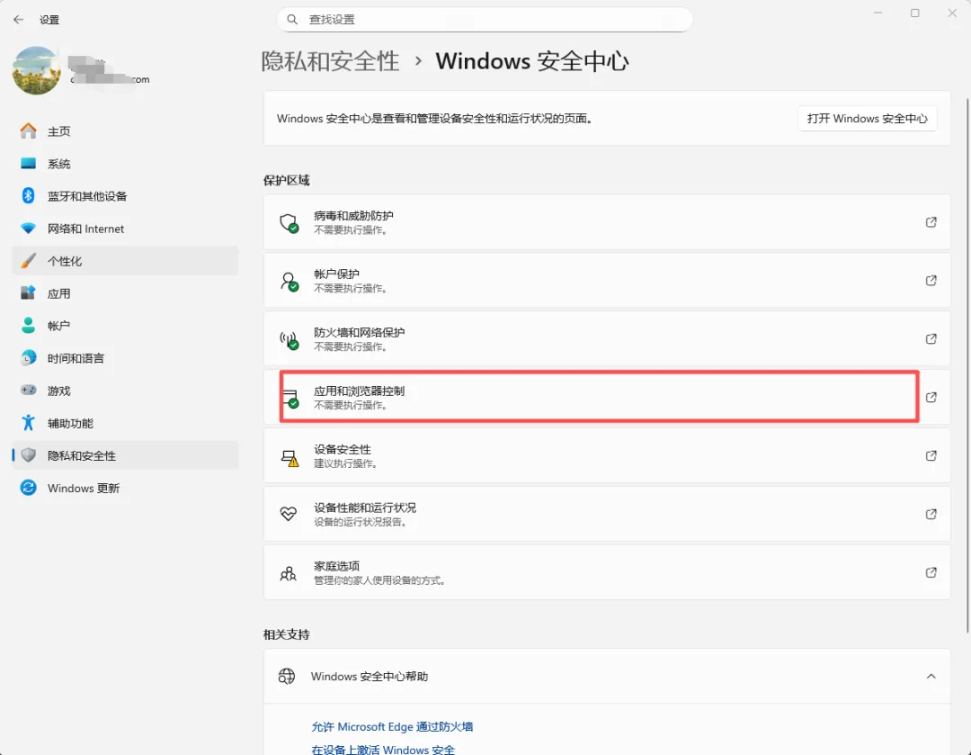 进入 隐私与安全 → Windows 安全中心