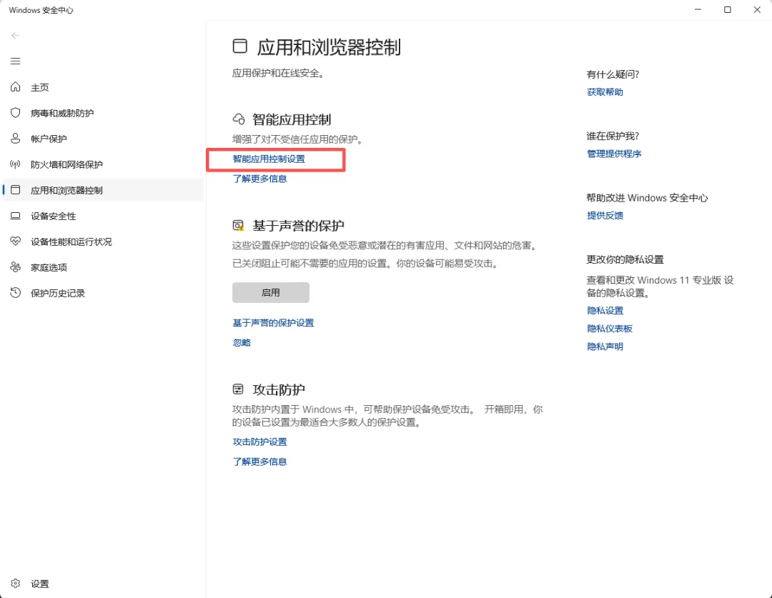 找到 智能应用控制(或 Smart App Control 设置)