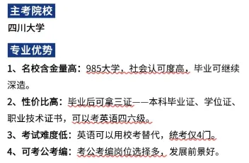 四川大学是国家 “双一流” 建设高校(A 类)、985 工程、211 工程重点建设大学,继续教育办学规范、学历学信网可查、社会认可度高。