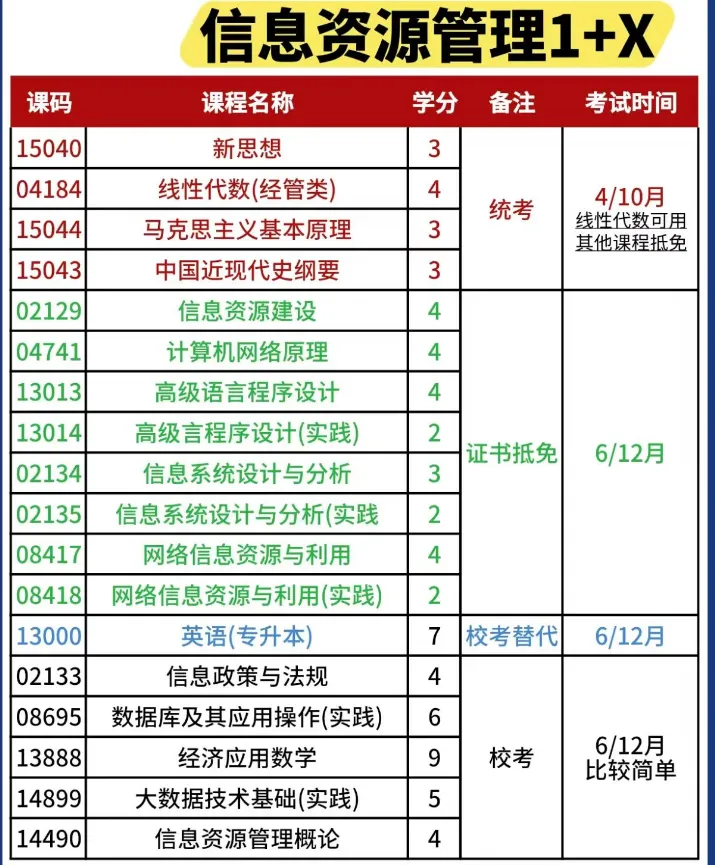 通过信息资源管理师职业能力认证证书(中级)考试,可直接顶替多门统考 / 校考课程,成绩按合格认定,不用再学、不用再考。