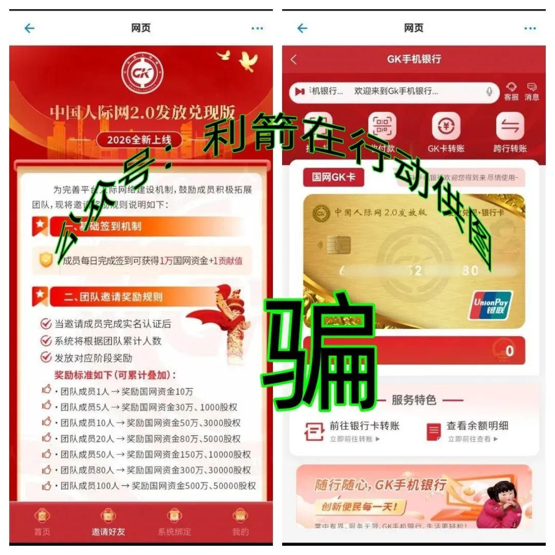 这是一眼假的诈骗套路,目的是让更多人掉进骗子设计好的圈套之中。至于给参与者发放“国网GK卡”,这种假银行卡就是一张卡片而已,成本也就1元左右,里面有多少钱,都是谎言,按照同类型骗局套路,会让参与者交“激活费”、“账户管理费”、“验证费”、“个人所得税”、“U盾费”等等编造的费用,让被骗人无休无止的交钱,却不兑现,直到大家发现上当被骗不再交钱,或无钱再交,骗子发现已经骗不到几个钱了,就会关网跑路,再换别的名称出来骗钱。