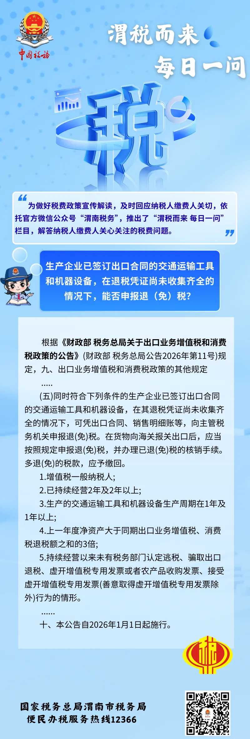 生产企业已签订出口合同的交通运输工具和机器设备,在退税凭证尚未收集齐全的情况下,能否申报退(免)税? 点击上方蓝字关注我们 来源:市局纳税服务中心 公告声明: 若来源标注错误或侵犯了您的合法权益,请及时与我们联系,我们将及时更正、删除。 联 系 我 们 service@fengchengmc.com 微信号:fengcheng-mc