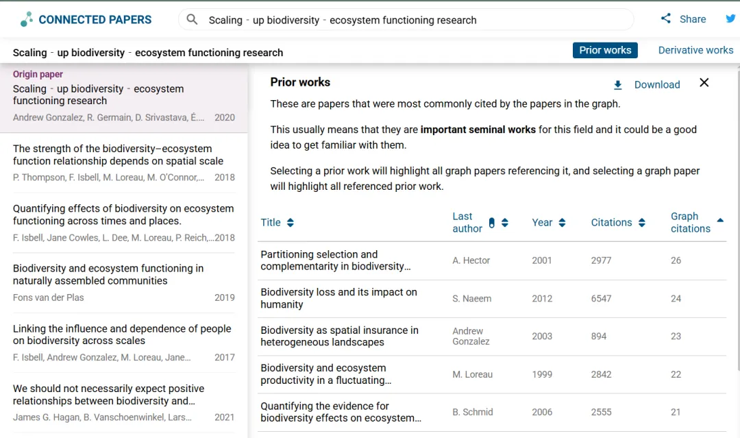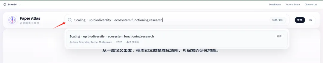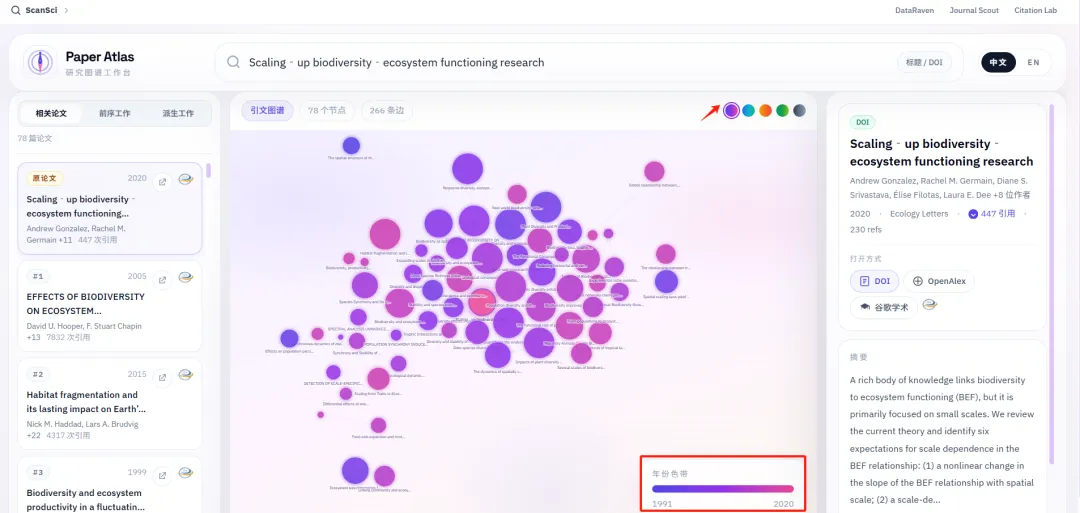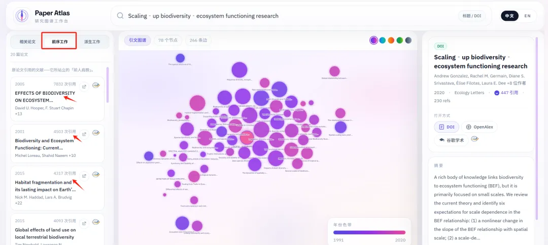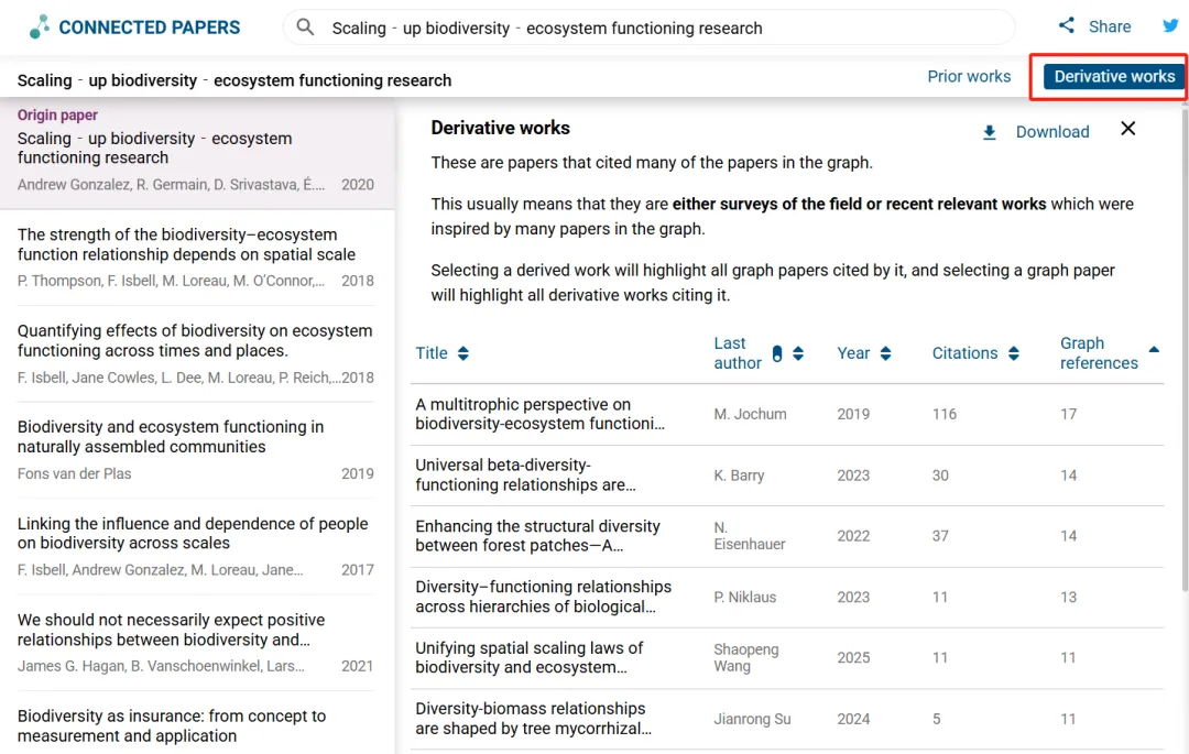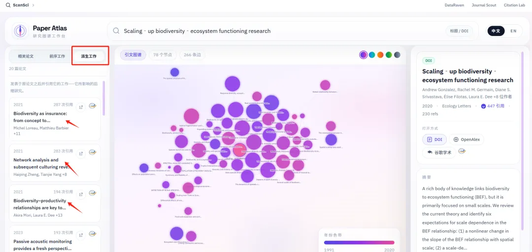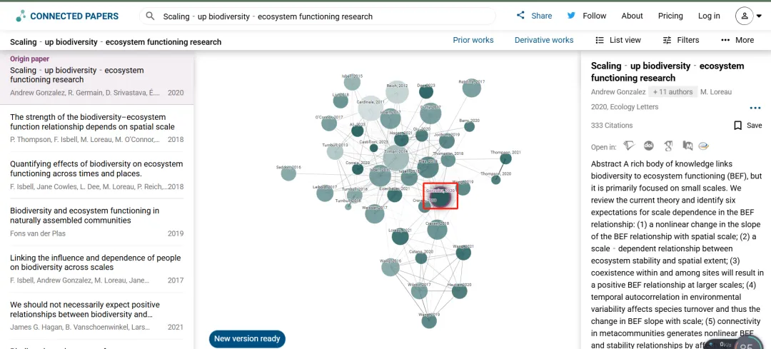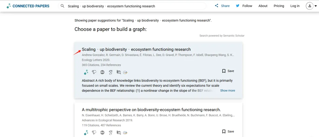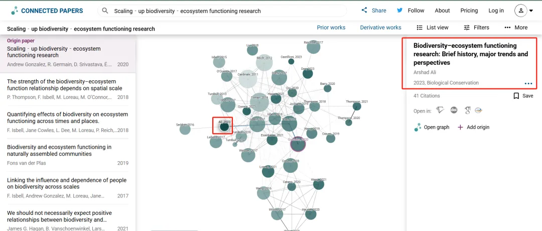 继续以在Connected Papers中检索的文献Scaling‐up biodiversity‐ecosystem functioning research为例,进行示范。