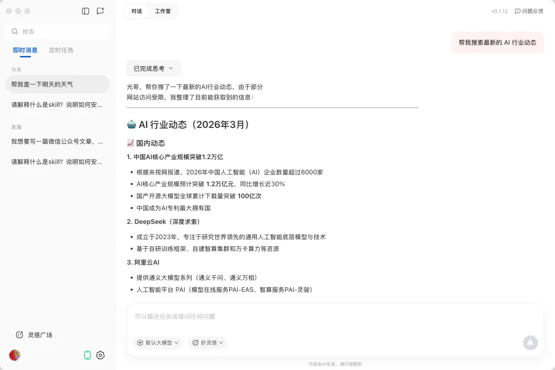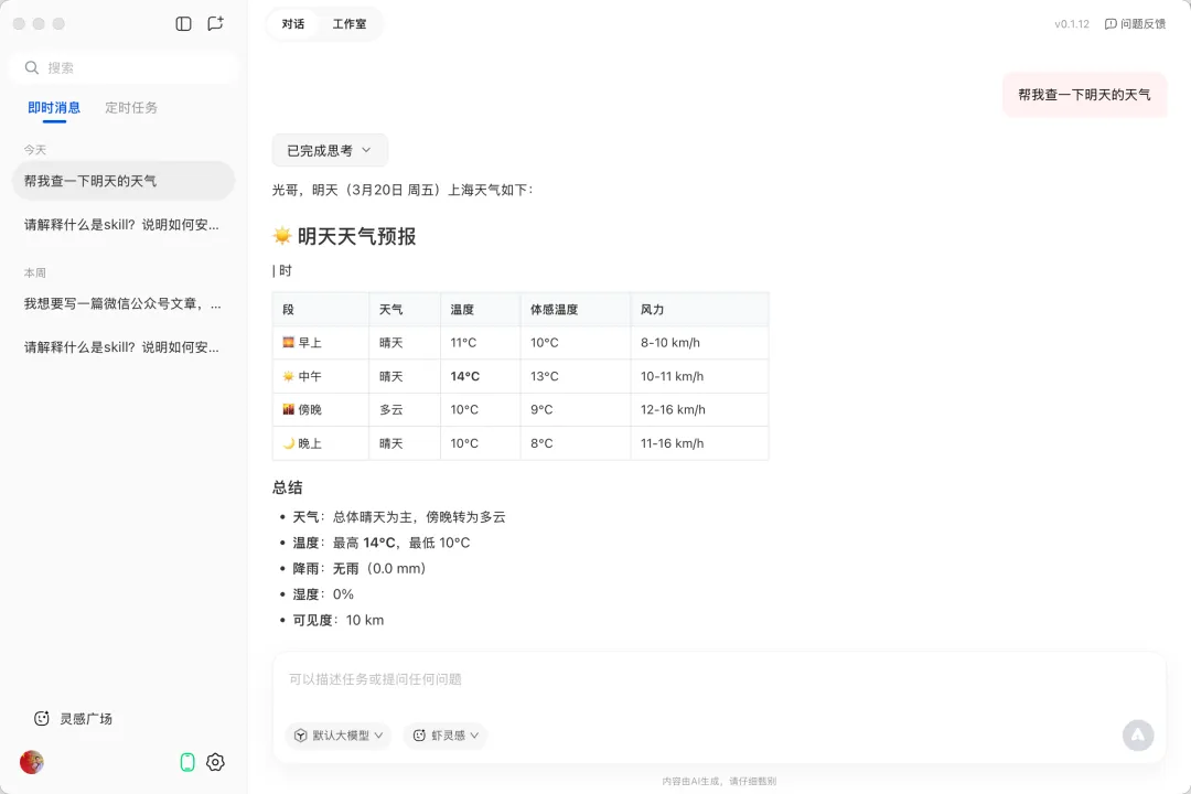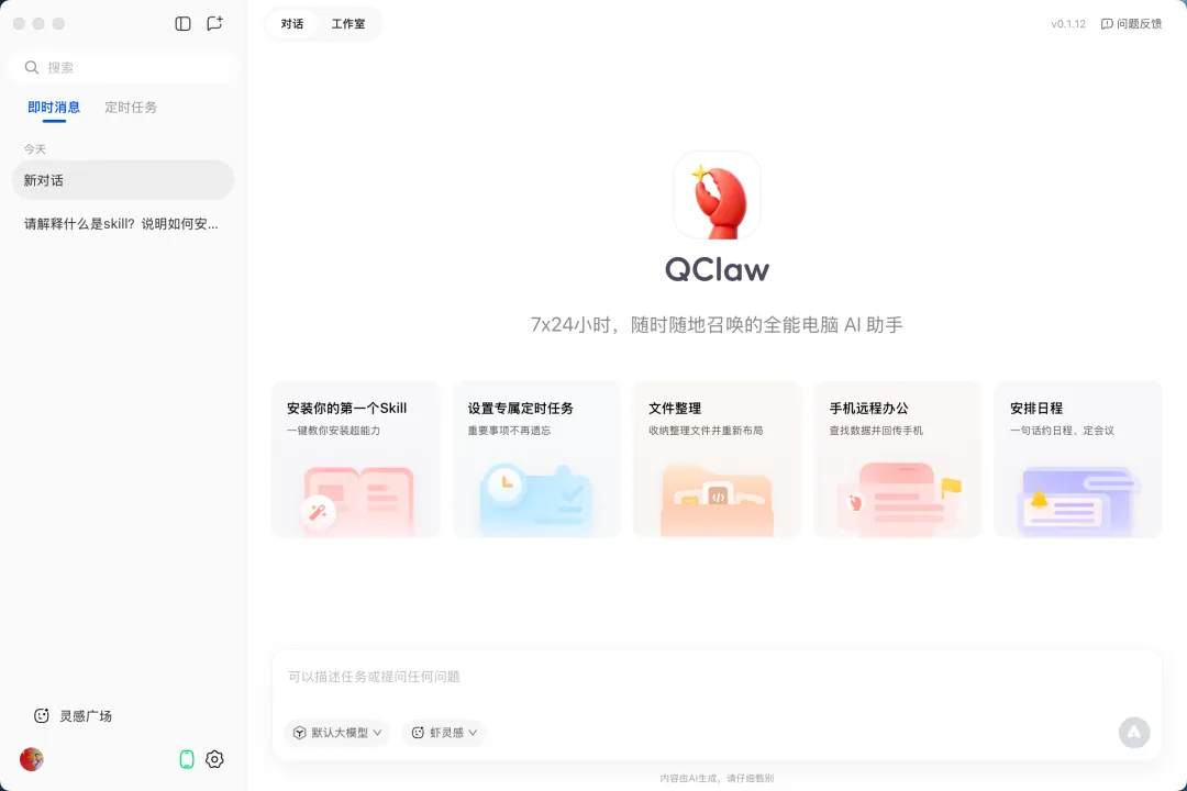 打开 QClaw 后,你会看到一个简洁的对话界面。直接用自然语言和它说话就行,不需要学习任何特殊指令。