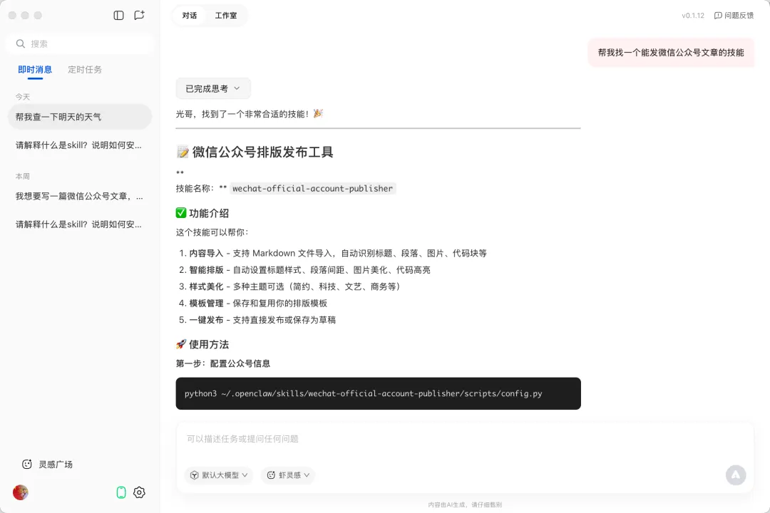 直接告诉 QClaw:”帮我找一个能发微信公众号文章的技能”