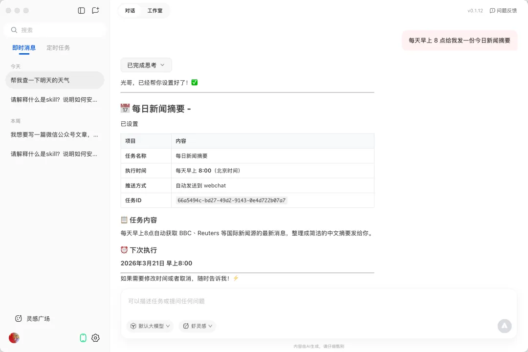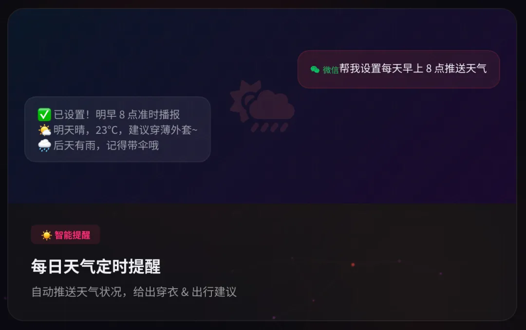 • “每天早上 8 点给我发一份今日新闻摘要”