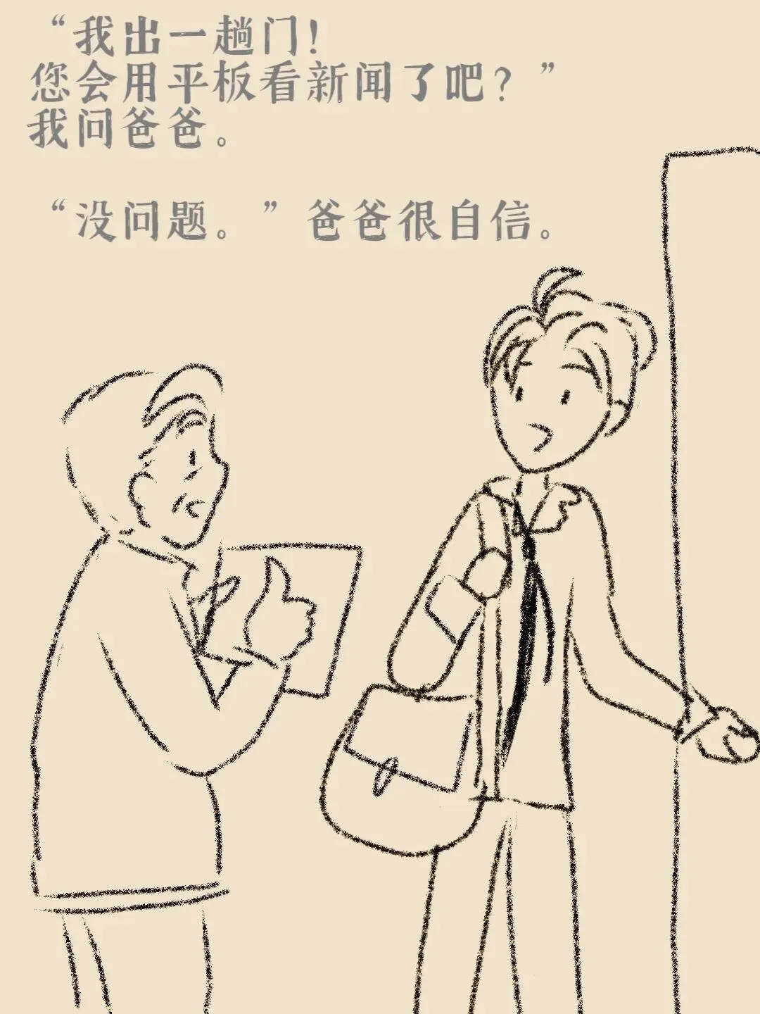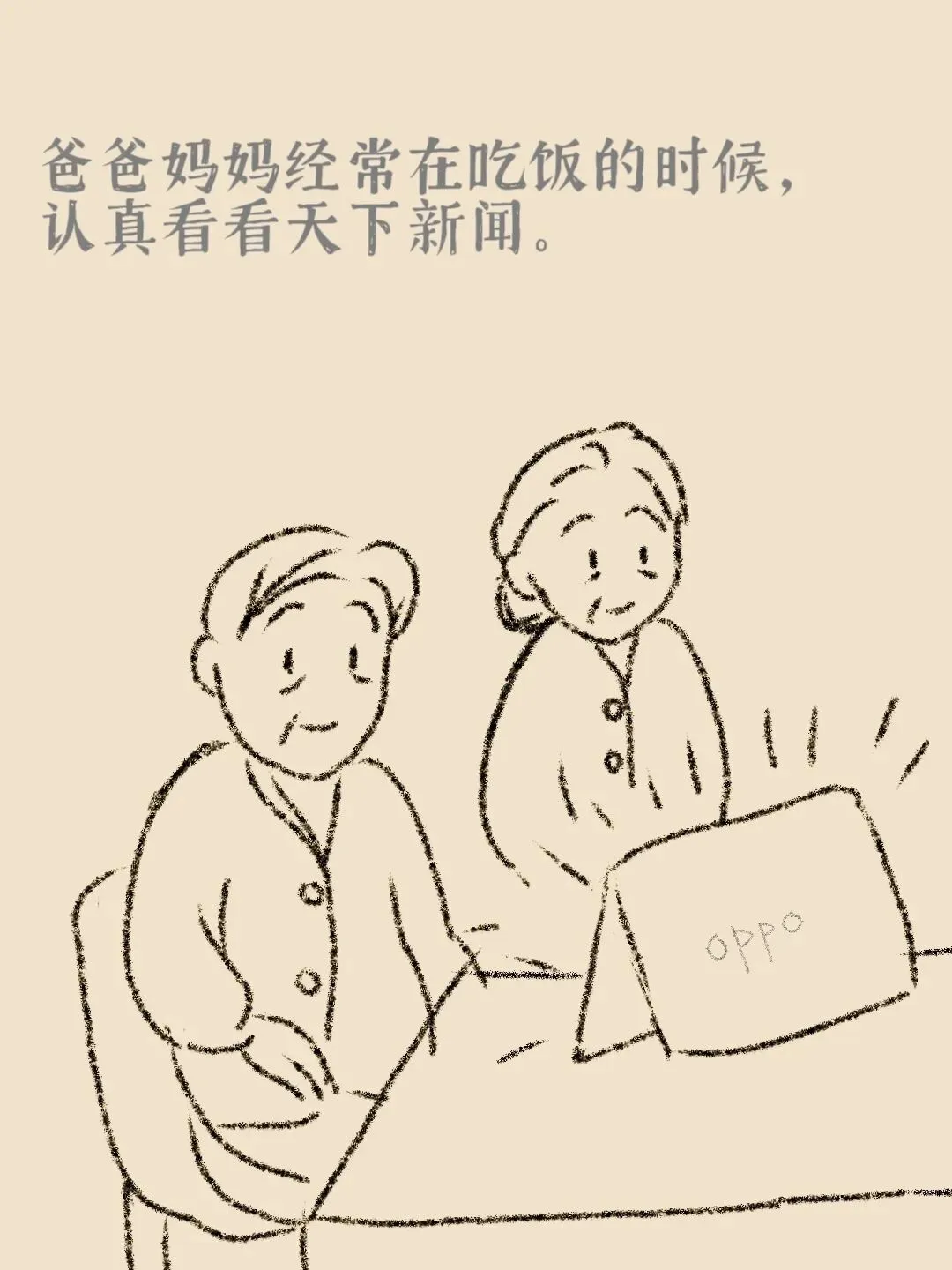 再看餐桌边认真盯着屏幕八十岁的老爸爸和老妈妈,