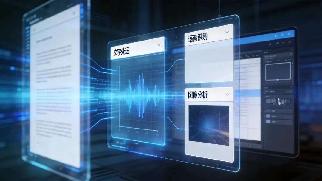 图片提示词:”AI助手正在同时处理文字、语音、图像信息,有数据流和界面交互,展示多模态处理能力,未来科技感”