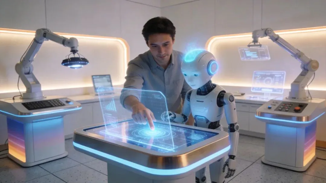 图片提示词:”人类与AI助手在和谐的工作室中协作,有各种高科技设备,展现伙伴关系,温馨而富有未来感”