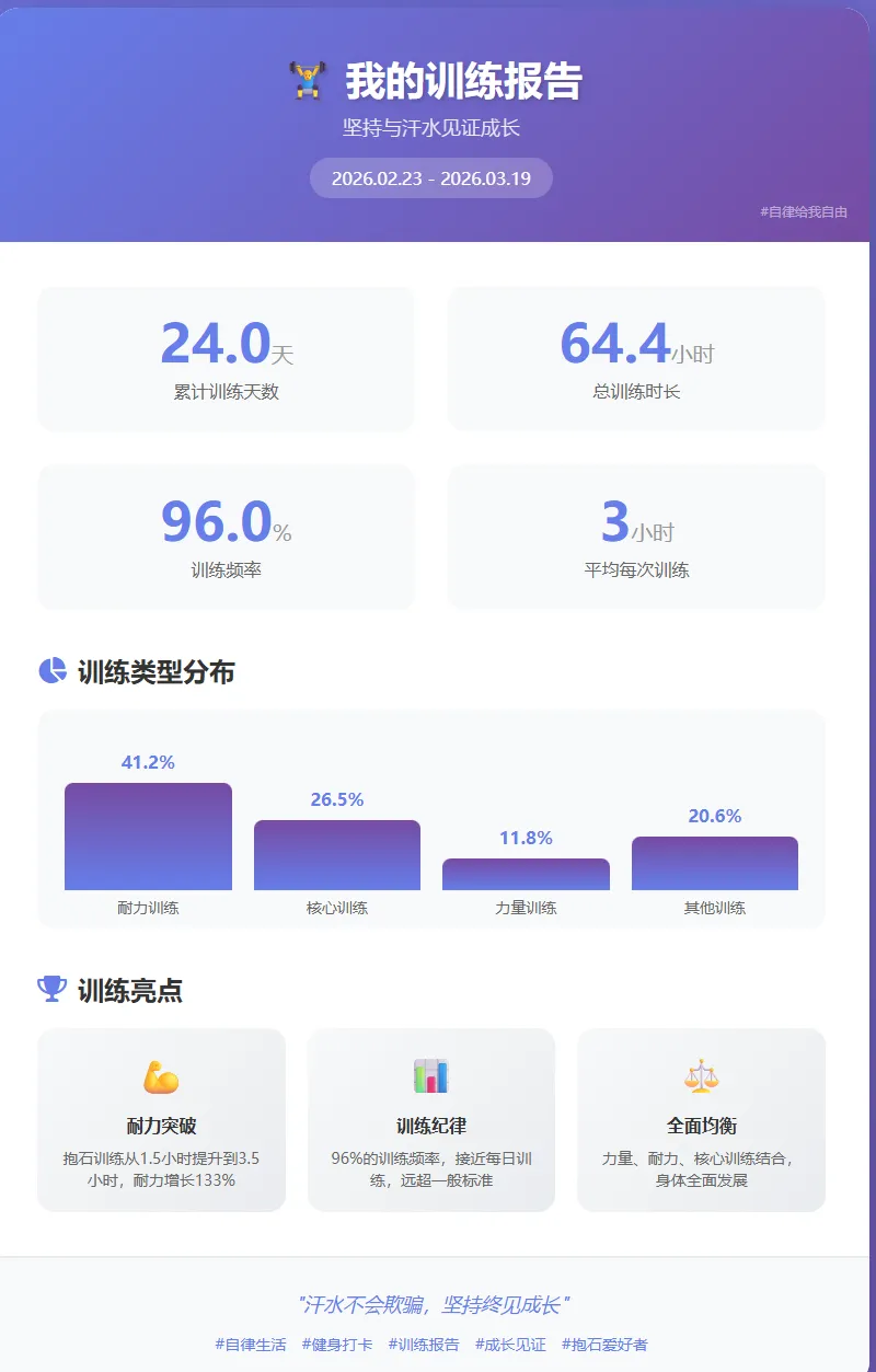 🏋️♂️ 24天训练总结:✅ 训练天数:24天(96%频率)✅ 总时长:64.4小时✅ 平均每次:2.7小时✅ 耐力增长:+133%