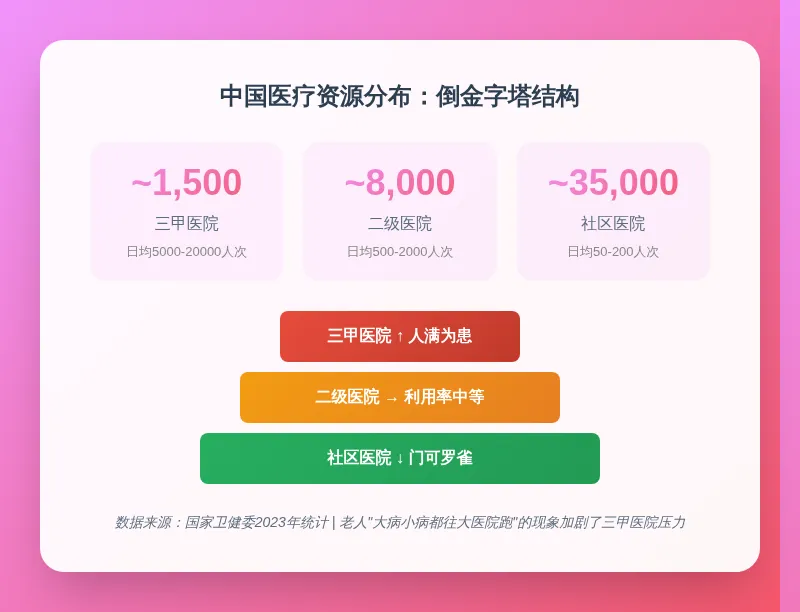 我国医疗资源的供需失衡问题一直存在,优质医疗资源主要集中在大中城市的三甲医院,而基层医疗机构的资源配置相对薄弱。虽然国家大力推进分级诊疗,但“基层首诊”的激励机制不足——医保报销差额小,基层医生收入低,导致很多老人宁愿花更多的钱、排更长的队去三甲医院,也不愿去社区医院看病。