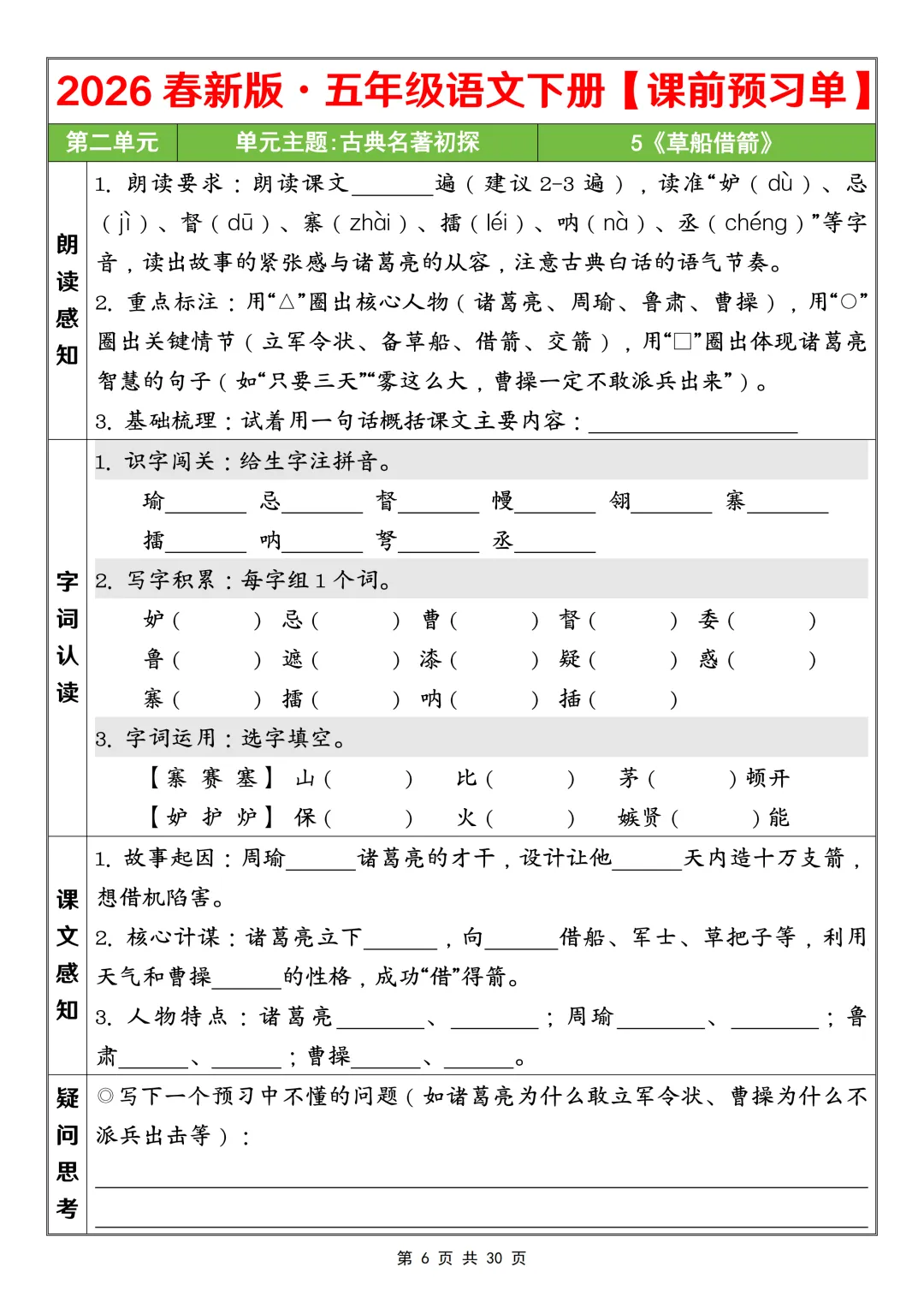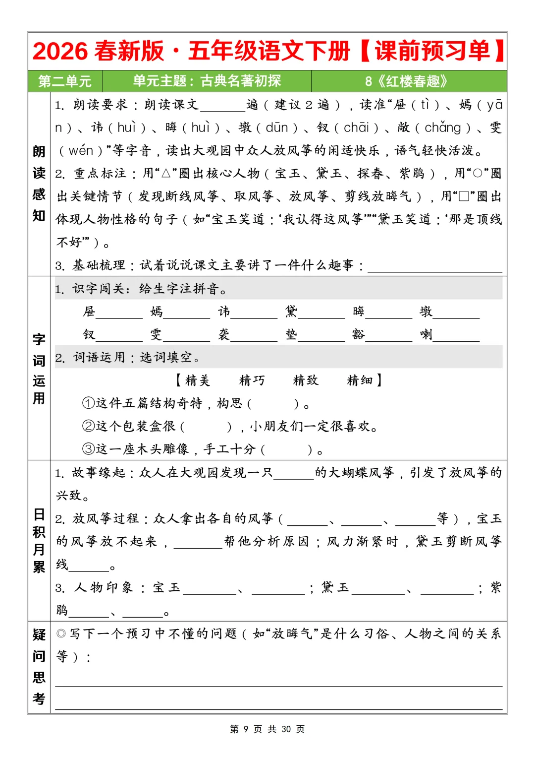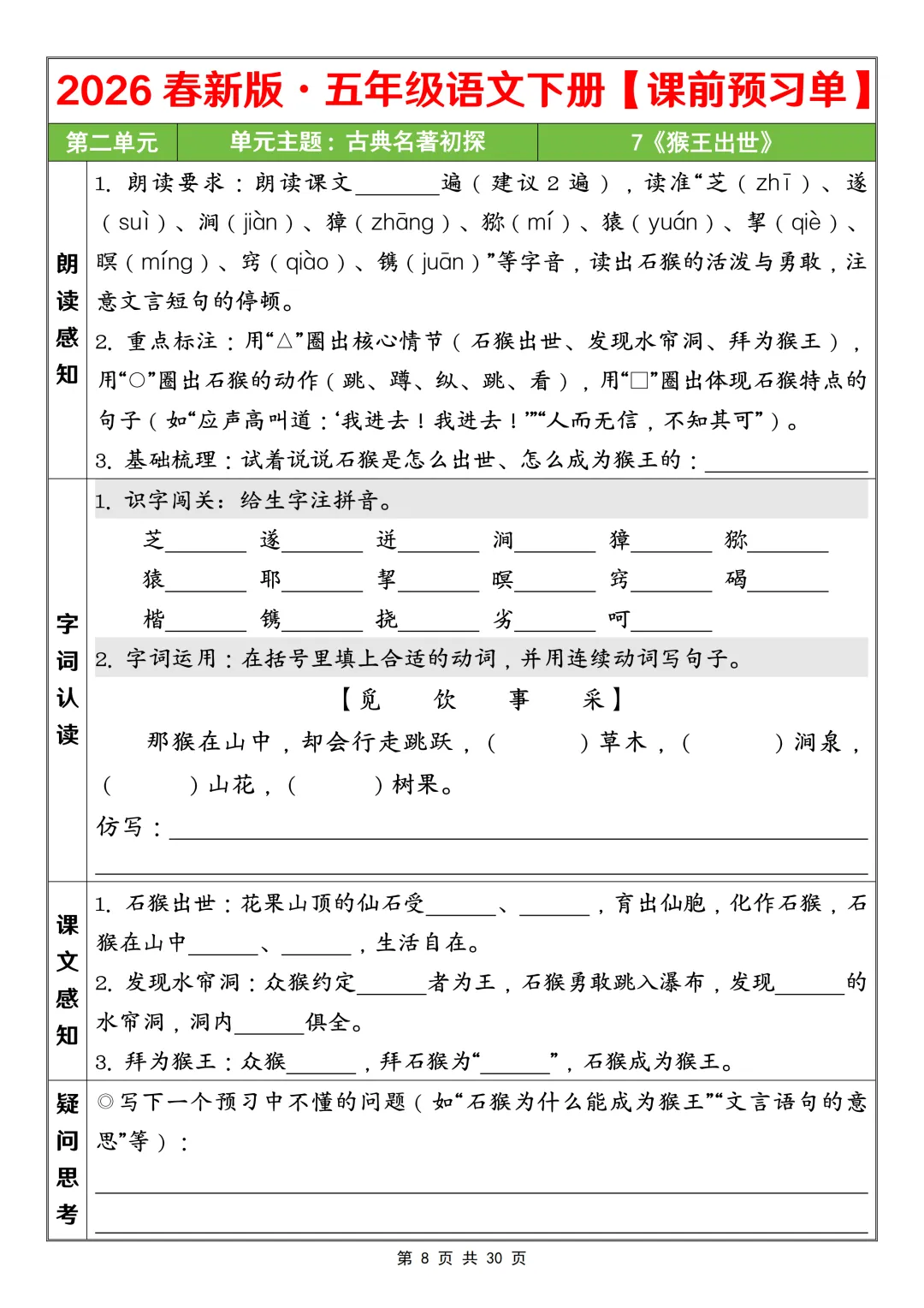 各位家长们,新学期为大家推荐《2026 年新版小学语文五年级下册语文第二单元课前预习单》,紧扣单元 “古典名著初探” 主题,覆盖《草船借箭》《景阳冈》《猴王出世》《红楼春趣》4 篇经典名著选文及语文园地二,适配五年级古典名著学习的核心预习需求。每份预习单均按 “朗读感知 – 字词认读 – 课文感知 – 疑问思考” 科学架构,朗读要求明确(标注字音、语气基调),重点标注核心人物、关键情节与人物特点句;字词部分包含注音、组词、选词填空、古典词语释义等针对性训练,贴合古典名著的字词积累重点;课文感知聚焦故事脉络、人物形象与名著特色,深度对接古典名著学习难点;还预留疑问栏引导主动探究。内容兼顾基础巩固与思维拓展,既帮助孩子提前梳理名著核心、攻克古典字词难关,又培养文本分析与古典文学鉴赏能力,为课堂高效学习与名著深度阅读奠定基础,是同步单元学习、提升古典名著预习质量的实用资料。