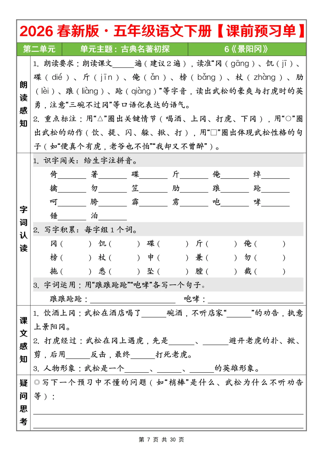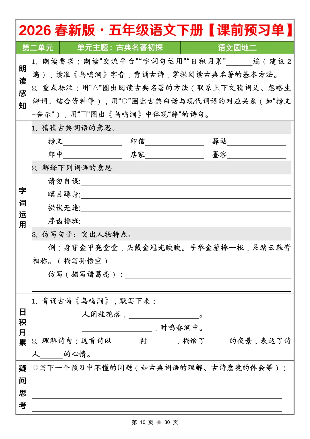 2026 春五年级下册语文|第二单元课前预习单 古典名著初探 含 4 篇课文 + 语文园地(电子版+免费下载+学习资源)