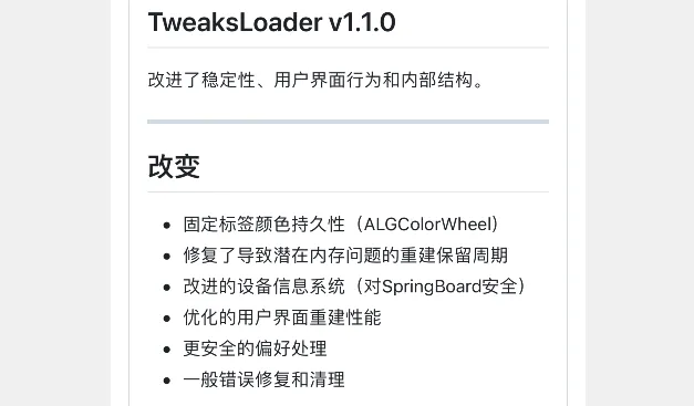 在3月19日下午时段,iAldazActivator 开发者针对 TweaksLoader 插件更新,推出 1.1.0 版本,本次更新主要提升稳定性及UI界面改进。