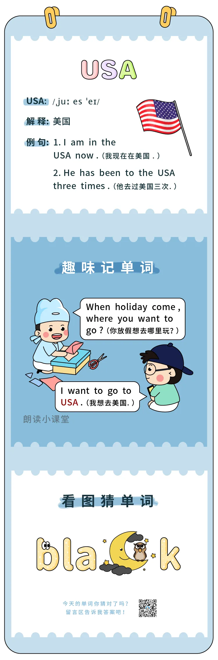 【单词漫画056】 USA(美国) ▲点上方绿标,跟着朗读君,看漫画,学单词 作者丨朗读君 来源丨朗读君英语(id:langdujun170) 更多英语工具 点击下方卡片,学习吧! ▼ 点击下方图片 一起看看看【正确答案】 ▼ 学会了在这里集合~