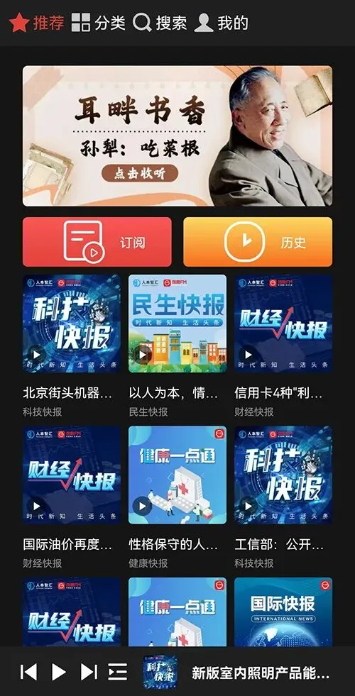 1. 先在手机、车机或电视上安装好这款应用,打开后首页就能直接收听民生、科技、财经、娱乐等各类实时资讯音频。