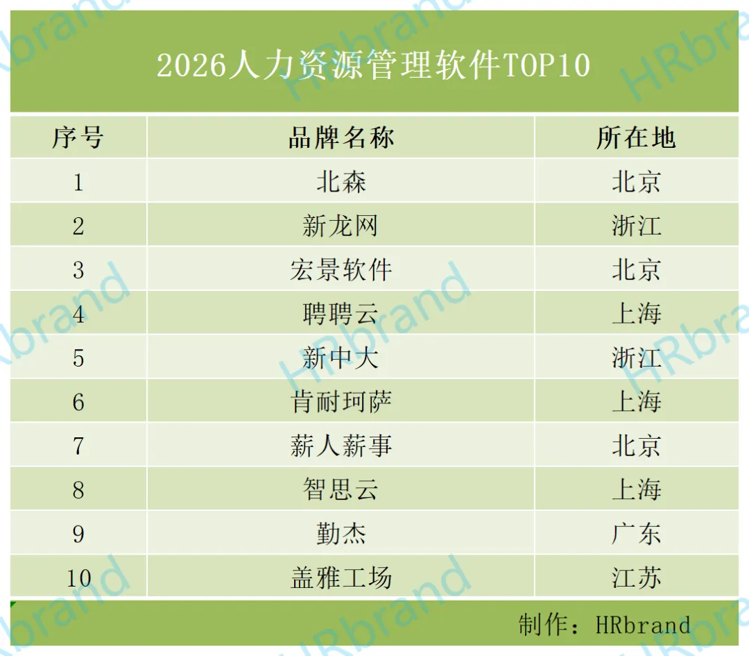 2026年3月20日,人力资源新媒体HRbrand发布“2026人力资源管理软件TOP10”榜单,北森、新龙网、宏景软件分别位列榜单前三位。