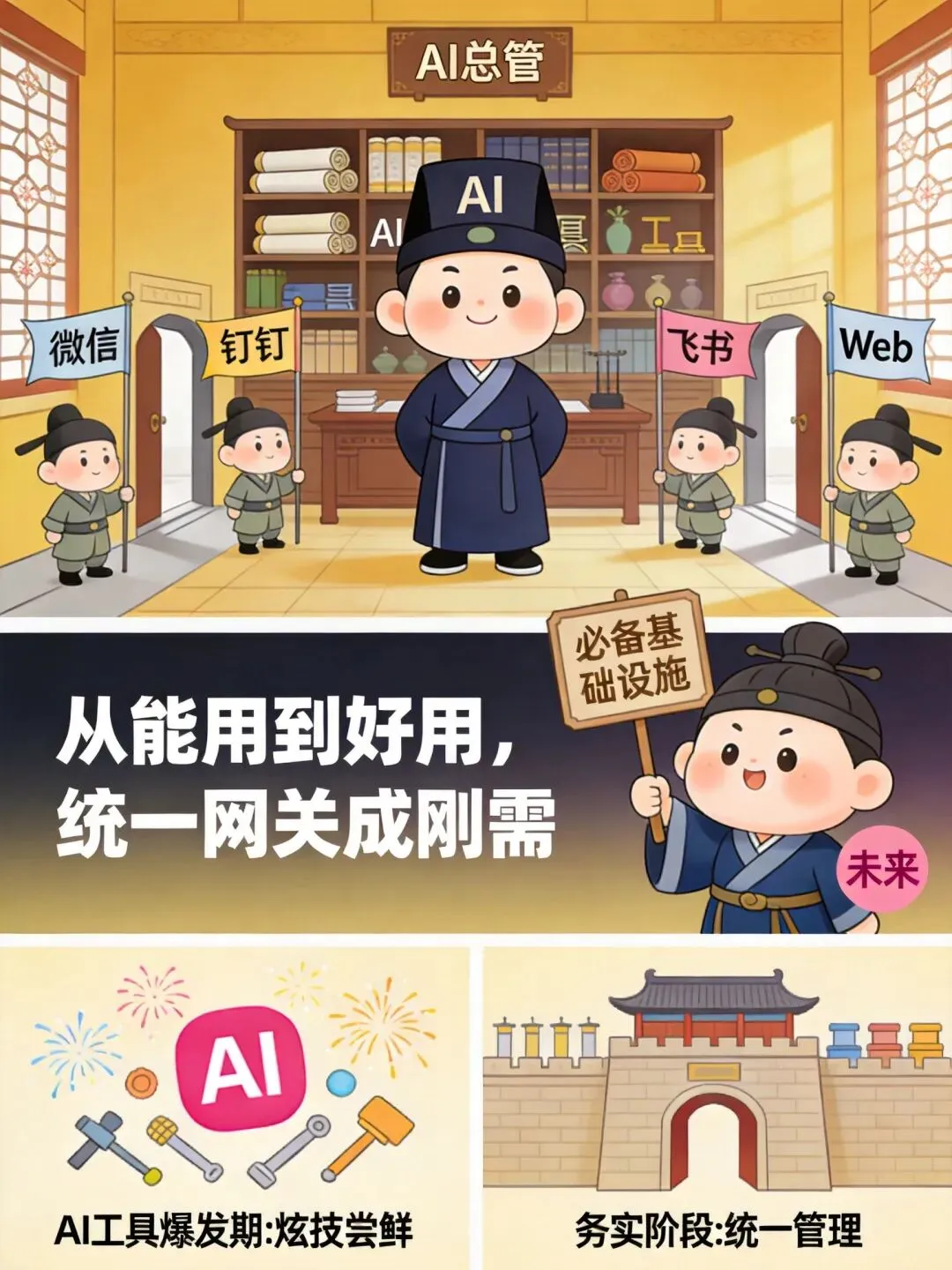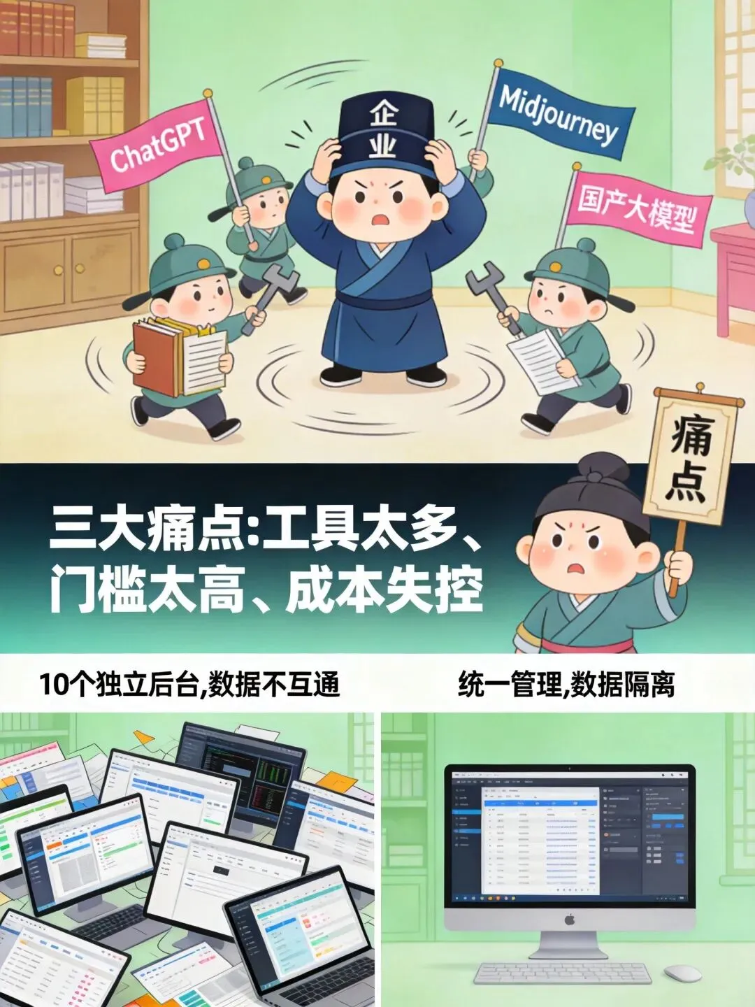 一家中型企业可能同时使用 ChatGPT 写文案、 Midjourney 做图、 Claude 写代码、国产大模型做客服……每款工具独立运作,账号分散、数据不互通,管理成本直线上升。