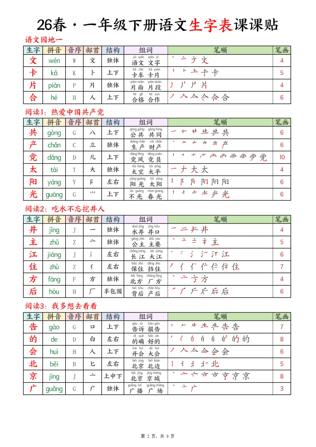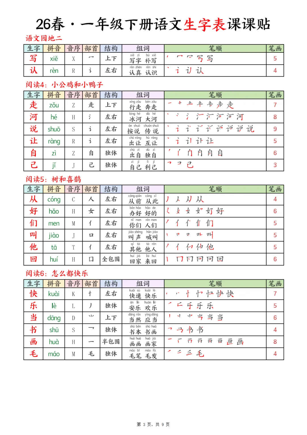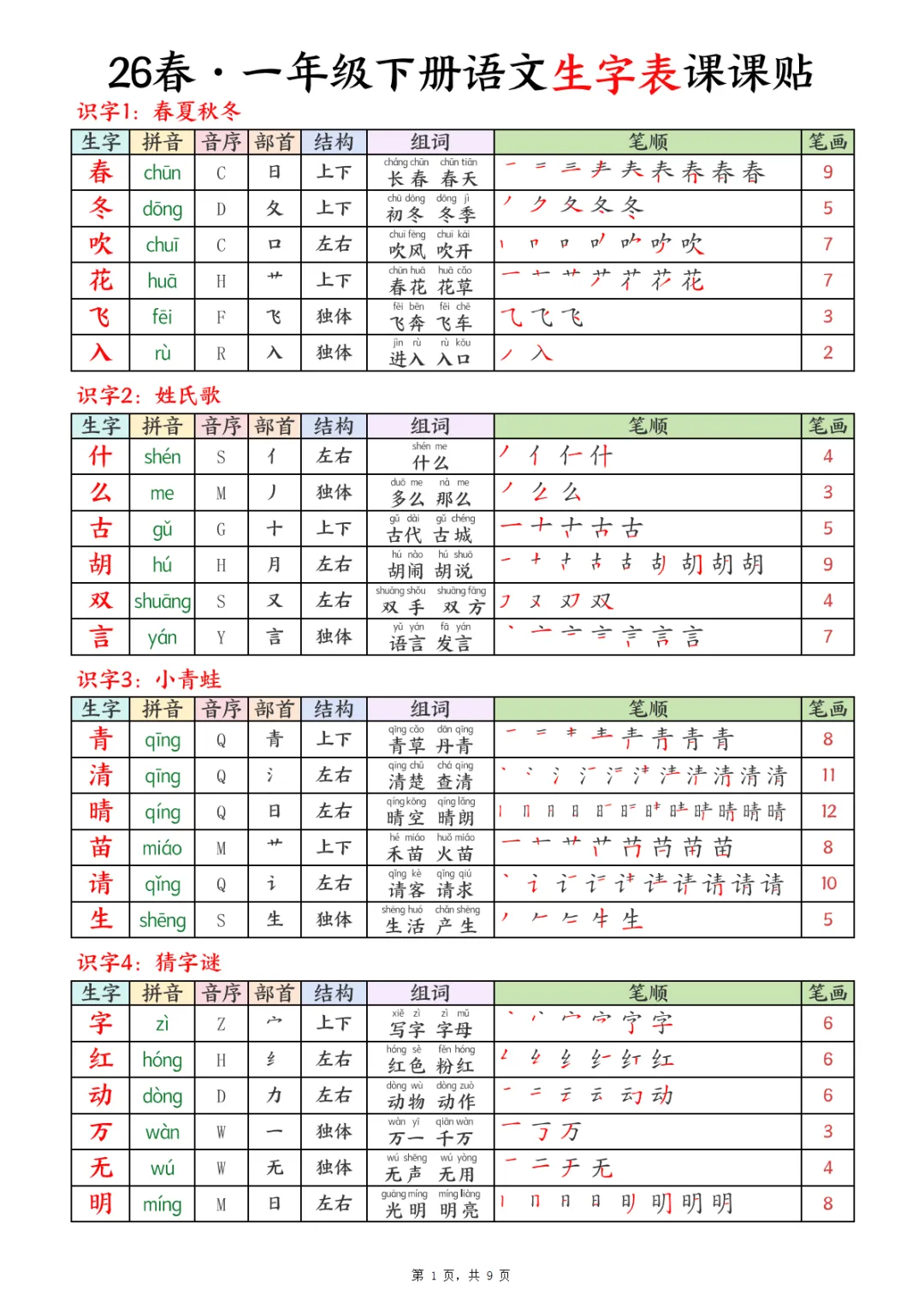 26春一下语文生字表课课贴9页