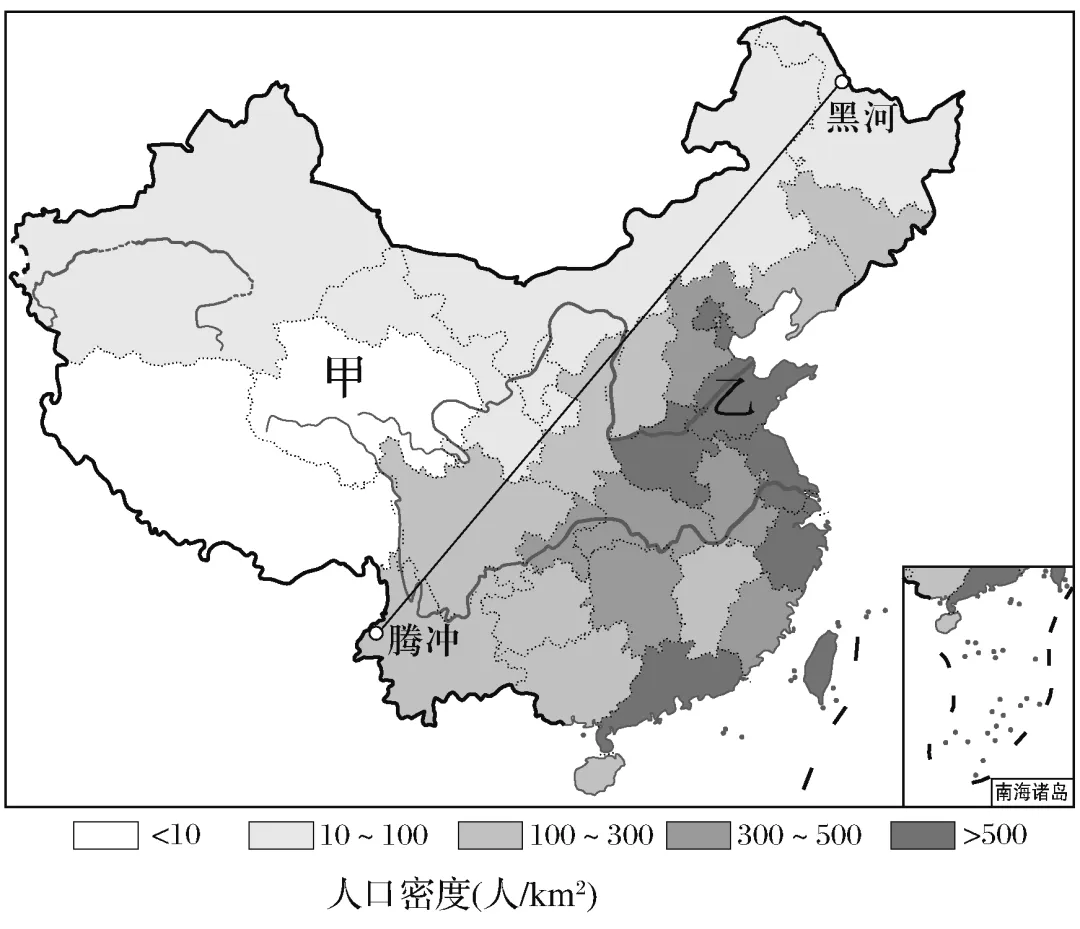 下图为“我国人口密度分布图”。据此完成1~2题。