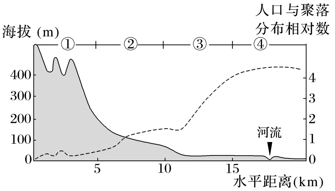 (2024·北京朝阳区期中)下图为“某区域地形剖面和人口分布相对数变化曲线图(人口分布相对数越大,人口数量越多)”。读图,完成3~4题。