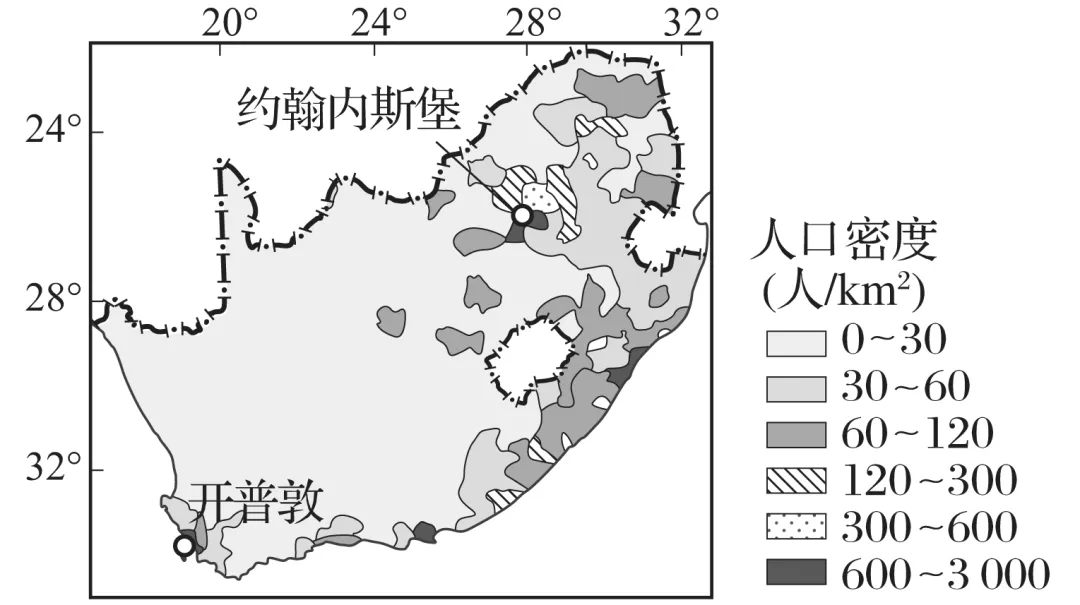 南非是非洲经济最发达的国家之一,矿产资源丰富,黄金和钻石产量居世界前列。约翰内斯堡是南非最大的城市,被誉为“黄金之城”。下图为“南非人口分布图”。据此完成5~6题。