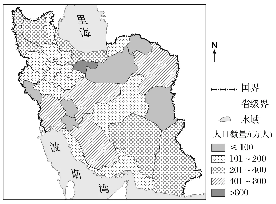 (2024·河北石家庄期末)伊朗位于亚洲西南部,山脉和高原约占国土总面积的90%,北部为里海沿岸平原,南部为伊朗高原,高原地区多分布有山间谷地和沙漠。下图示意2016年伊朗省级行政区的人口数量分布。完成7~8题。