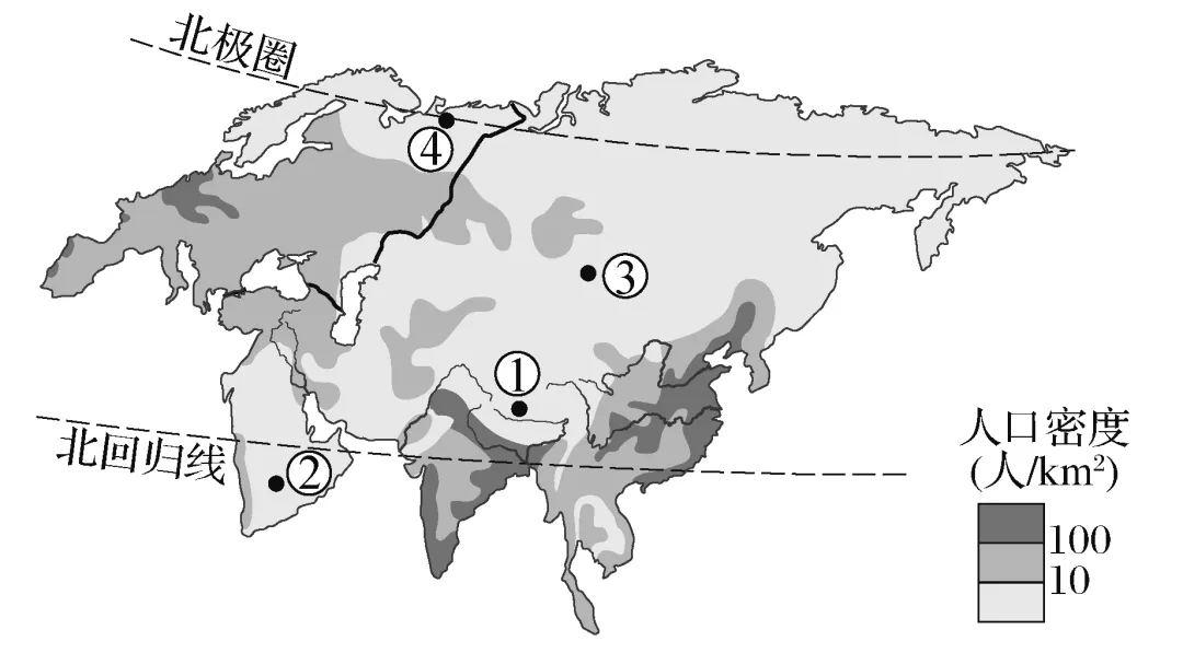 (2024·山西太原期中)下图为“亚欧大陆人口分布图”。读图,完成9~10题。