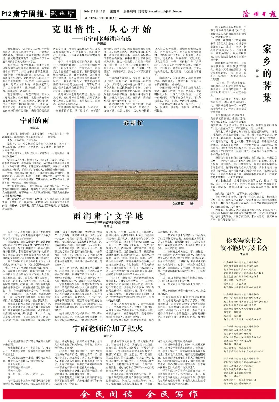 第671期《肃宁周报》“武垣风”电子版 总第671期 一,克服惰性,从心开始/齐殿玺 二,宁雨的雨/刘庆丰 三,家乡的荠菜/彭芹 四,雨润肃宁文学地/杨雪坦 五,宁雨老师给加了把火/徐桂花 六,你要写读书会,就不能只写读书会/李民强