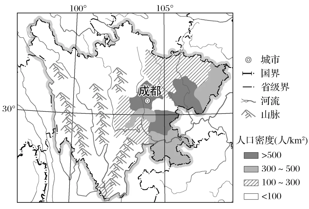 (2024·四川乐山期末)第七次全国人口普查结果显示,十年来四川跨省流入人口增加146.1万。下图为“四川省人口分布图”。完成1~2题。