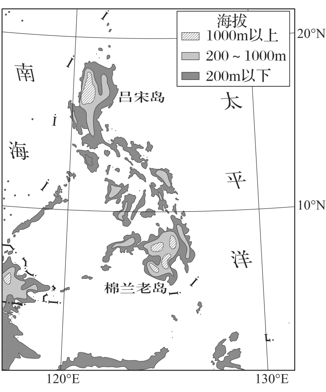 (2023·云南大理期中)菲律宾是世界人口比较稠密的国家之一,但大部分人口集中在北部的吕宋岛上,作为菲律宾古国发源地的棉兰老岛人口相对稀少,这给菲律宾发展带来巨大的压力。下图为“菲律宾地形示意图”。据此完成5~7题。