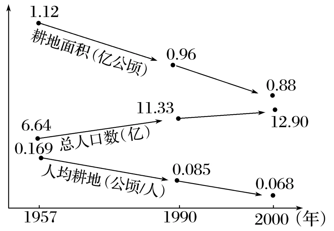 (2024·山东青岛调研)环境的承载能力是有限的。读“环境负担”公式和“我国人口与耕地变化图”,完成8~9题。