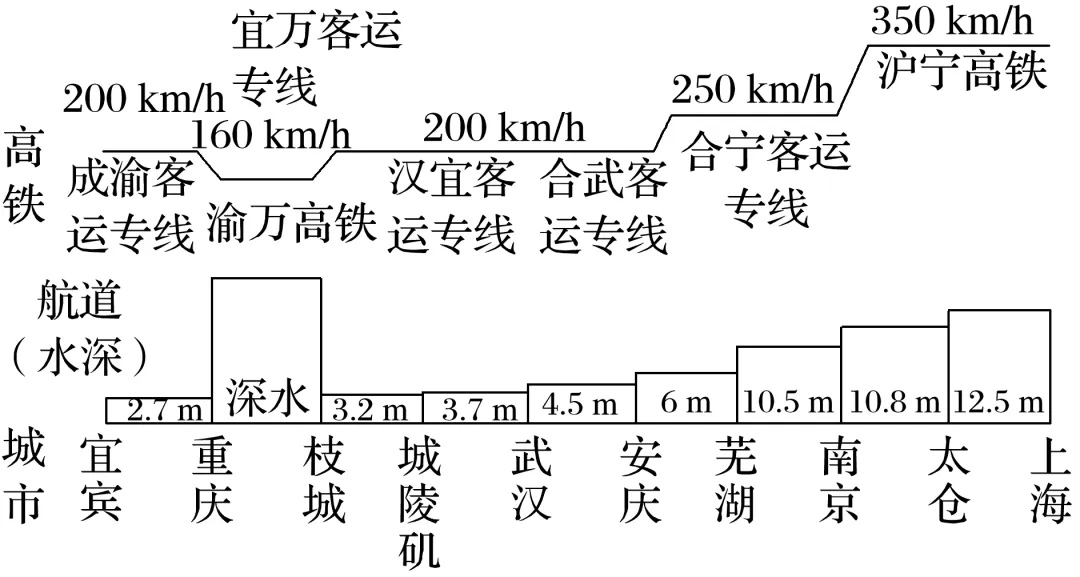 (2024·湖南永州期中)长江经济带的形成与发展,需要建设以长江黄金水道为核心,修建沿江高速公路和铁路为重要内容的长江立体化综合交通走廊。下图为“长江主航道各航段水深、沪汉蓉高铁各区段运行速度示意图”。据此完成10~11题。