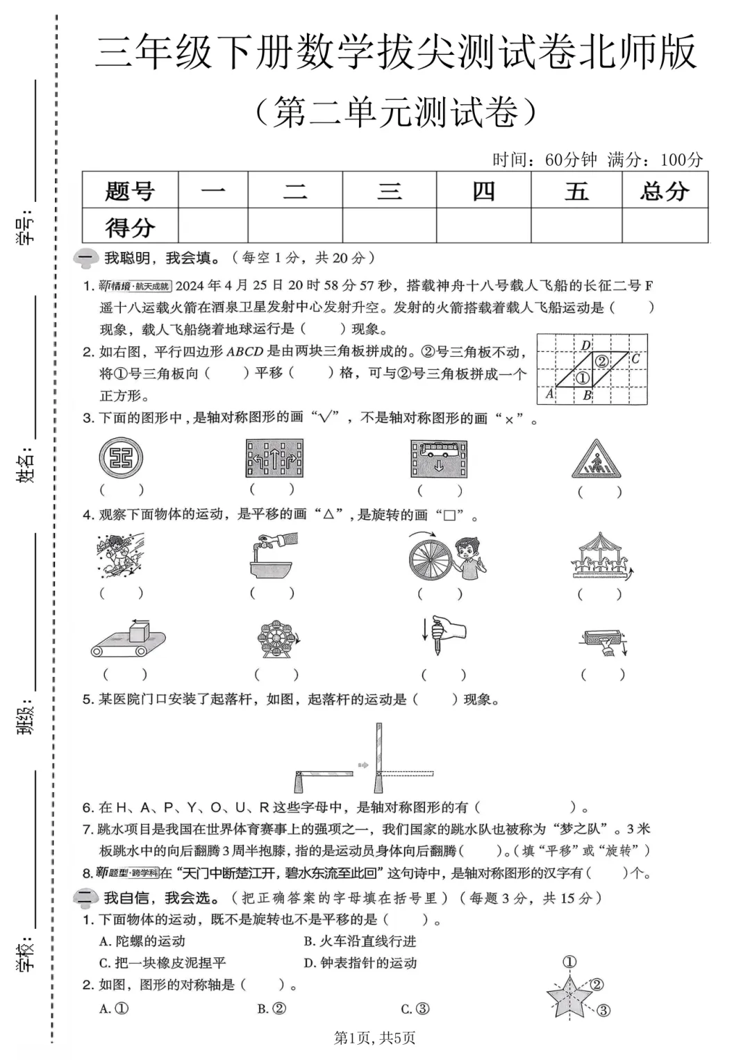 2026春三年级下册北师大版数学《第二单元拔尖测试卷》(含答案),电子版可下载打印。这份试卷紧扣平移、旋转、轴对称图形的单元核心知识点,题型丰富且梯度合理,融入航天、跳水、古诗等新情境和生活元素,题目设计兼具基础性与拓展性,同时结合动手操作类题目,能有效检测学生的知识掌握和应用能力。家长赶紧给孩子打印出来吧!